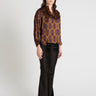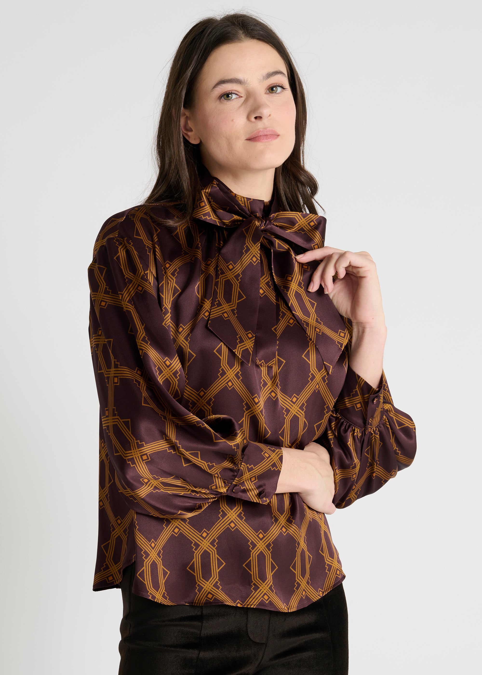Son col mao agrémenté d’une lavallière amovible permet de moduler le style : nouée pour une allure affirmée, laissée libre pour un esprit plus souple, ou retirée complètement pour un rendu épuré. Les manches légèrement bouffantes, resserrées par des poignets boutonnés, apportent du mouvement et de la souplesse à la silhouette.