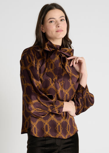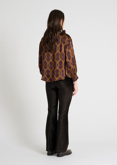 La blouse Halona aubergine joue la carte de l’élégance avec une touche rétro subtile.