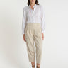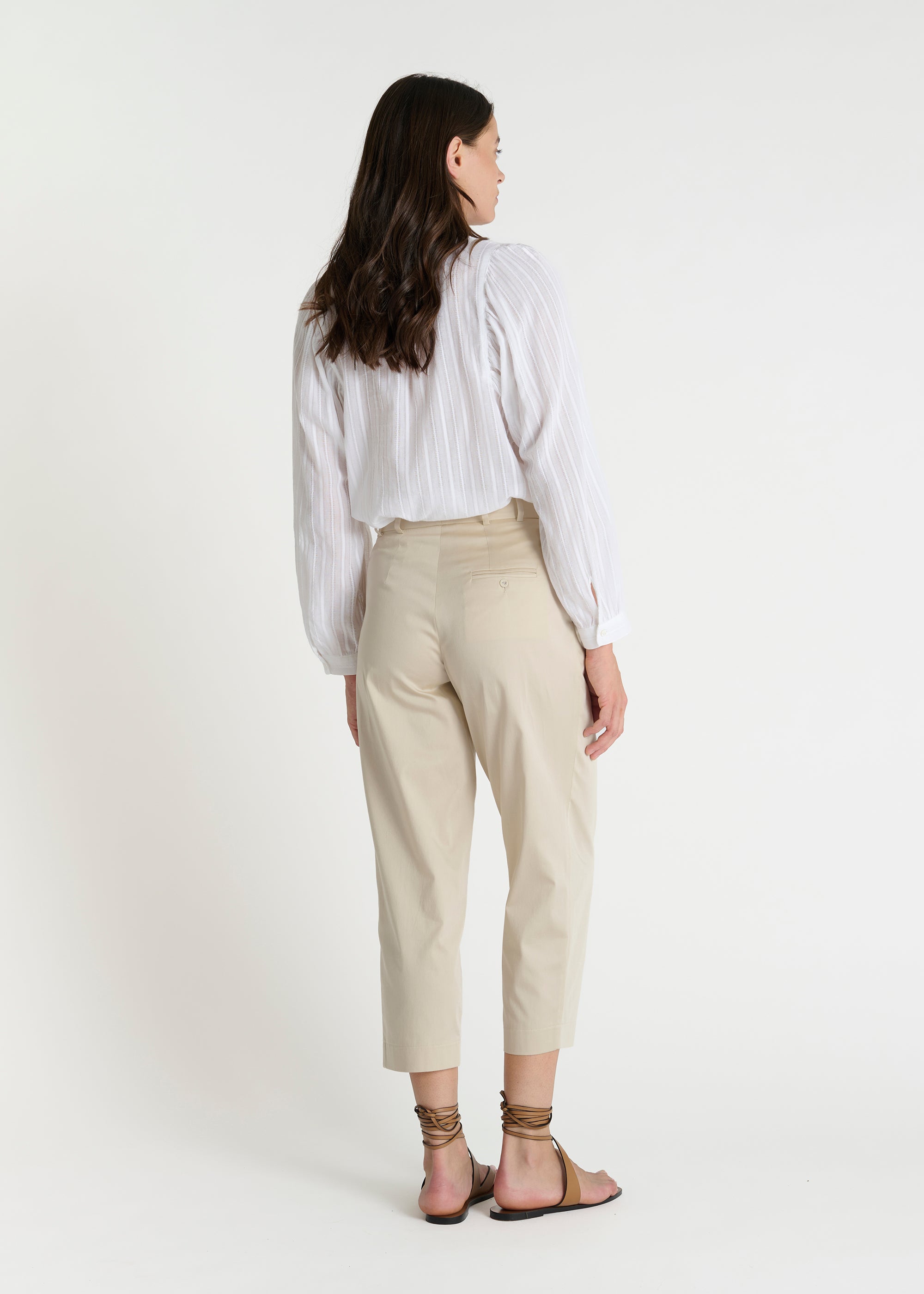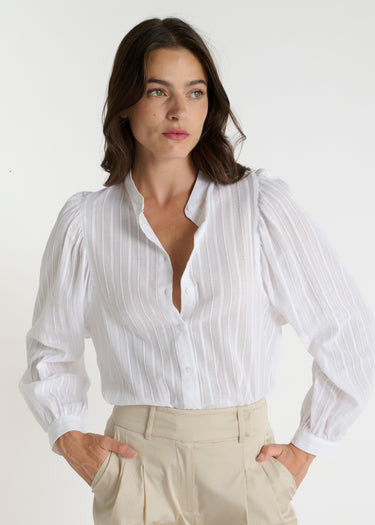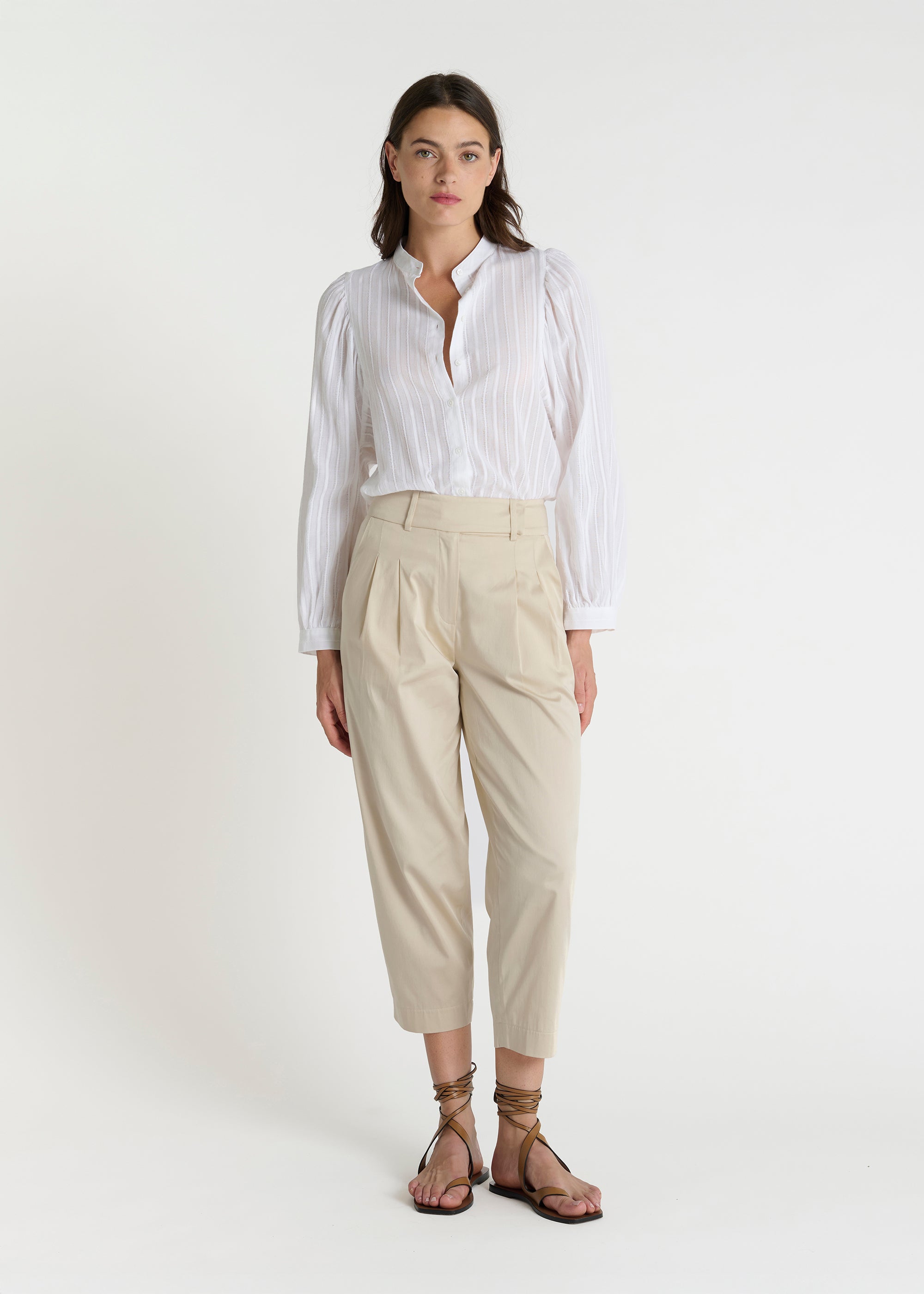 Avec la chemise Umila, profitez d’une allure à la fois épurée et sophistiquée. Conçue en voile de coton armuré, elle offre une légèreté agréable tout en affichant une belle tenue. Son volume droit s’adapte à toutes les silhouettes, tandis que les manches longues, agrémentées de smocks délicats et de fronces élégantes sur l’épaule, apportent une touche subtilement travaillée. L’encolure, fermée par une élégante rangée de huit boutons en nacre naturelle, ajoute une note de raffinement. À l’arrière, un pli creux dynamise la coupe et accompagne vos mouvements avec fluidité. Associez-la au pantalon Ravi pour un look casual chic parfait en toute occasion.