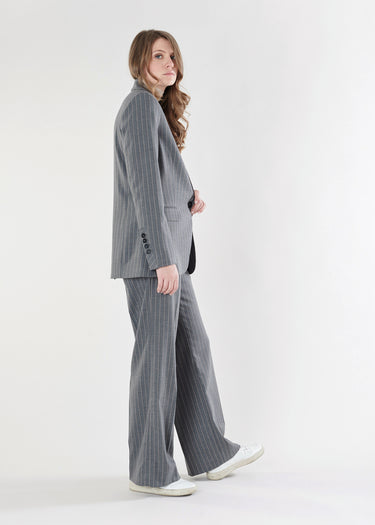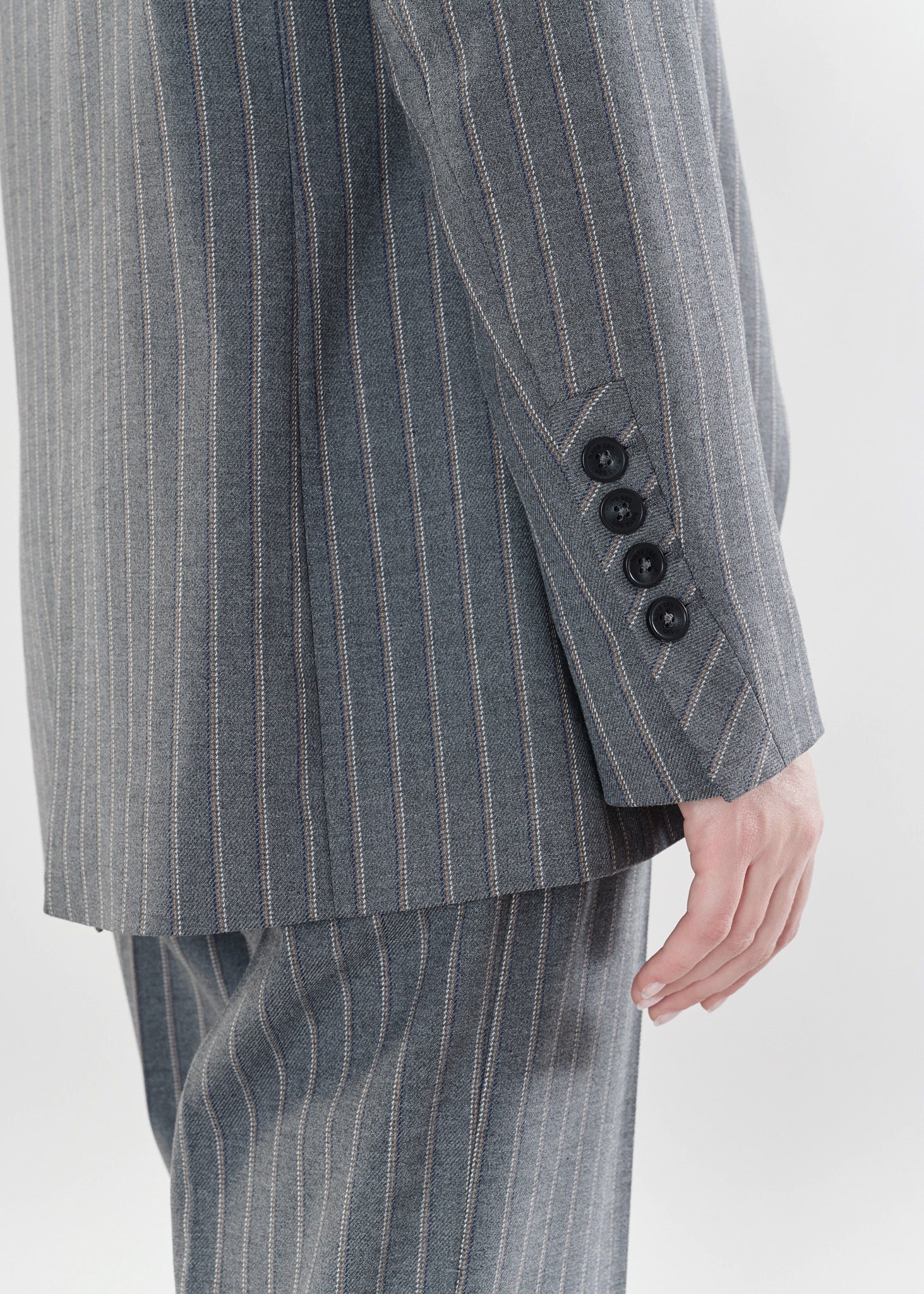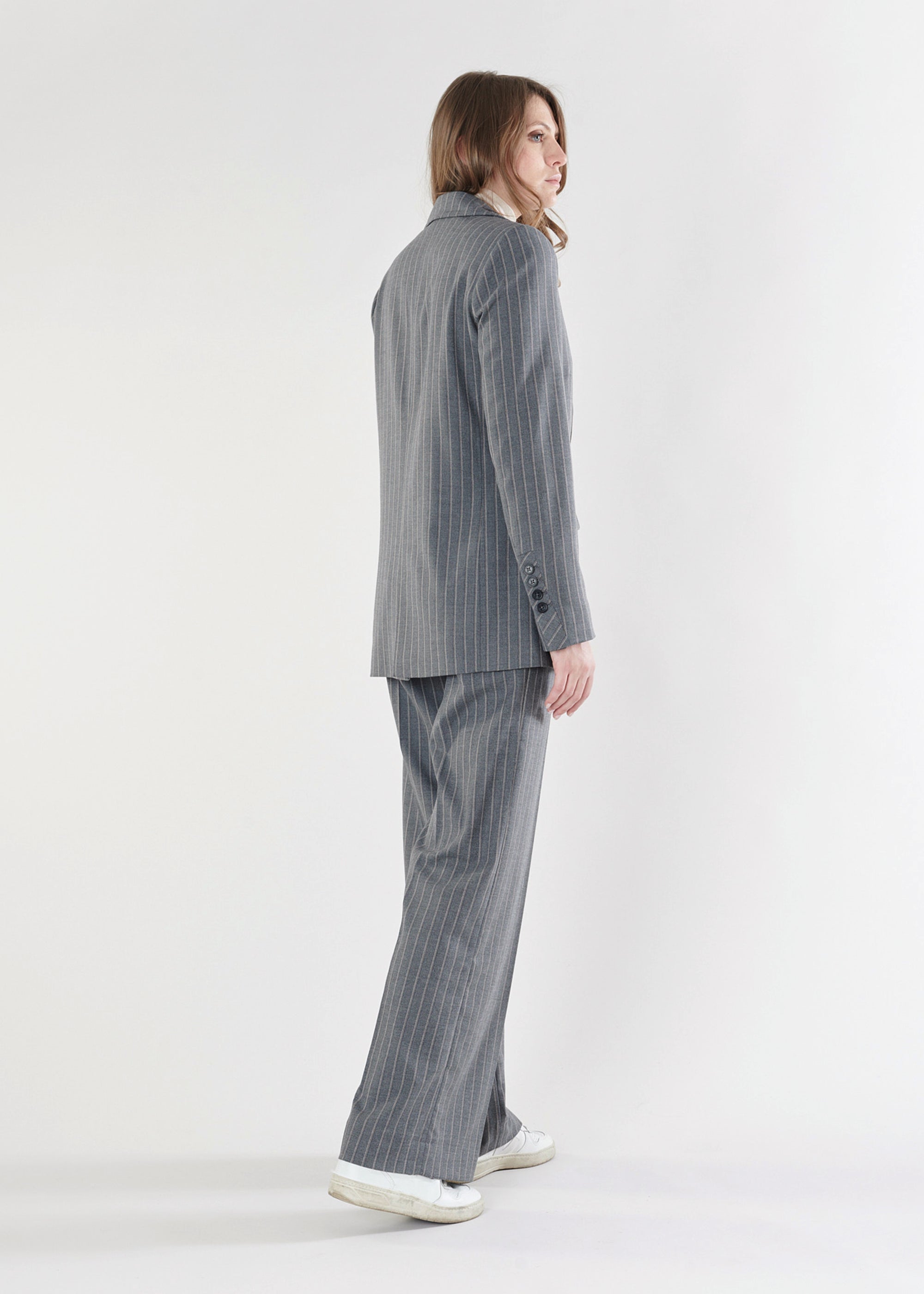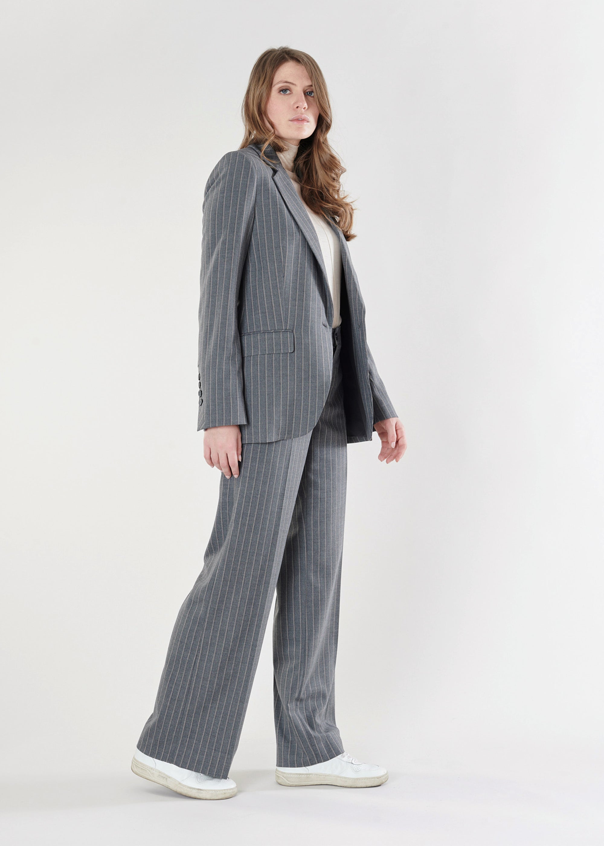 La veste Johanna revisite le blazer rayé avec une allure nette et féminine. Son col tailleur classique est fermé par un bouton en corozo, soulignant une ligne épurée. À l’avant, les poches à rabat apportent une touche structurée, tandis que les découpes placées dans le dos affinent la silhouette. Les manches, fendues et fermées par un bouton, offrent une finition soignée. Entièrement doublée, la base droite assure un tombé impeccable et un confort durable.