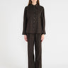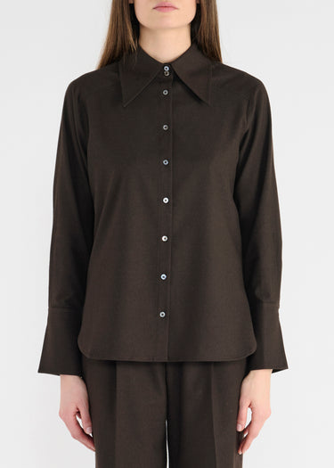 La chemise Nanna en flanelle allie confort et sophistication avec subtilité. Son col se ferme par neuf boutons, dissimulés sous une élégante patte de boutonnage, assurant une finition impeccable. À l'arrière, un pli creux ajoute une touche de structure raffinée, tandis que les manches longues se terminent par des poignets ajustés d'un bouton, apportant une allure soignée. La coupe légèrement arrondie de sa base offre une silhouette flatteuse et polyvalente, parfaite pour toutes les occasions.