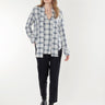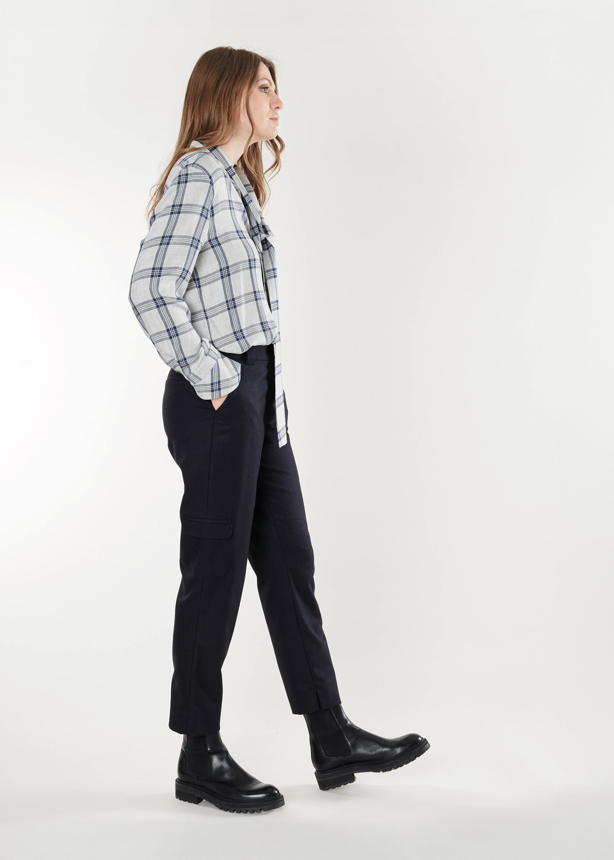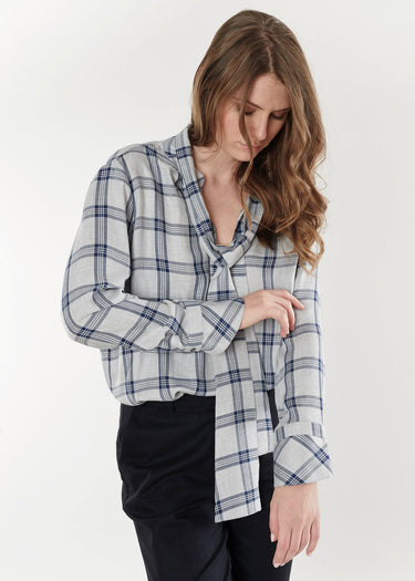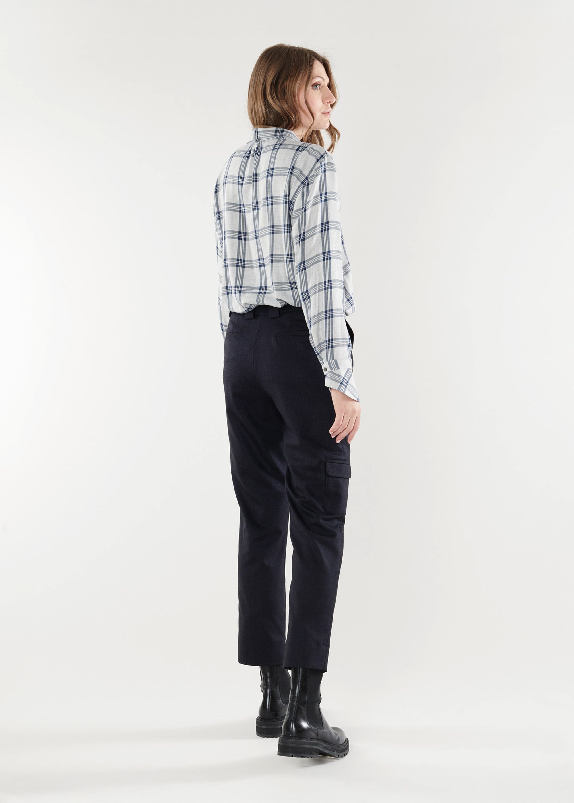 Blouse en viscose à carreaux conjuguant fonctionnalité et esthétique épurée. Col mao ouvert complété d'une lavallière amovible pour une adaptabilité stylistique remarquable. Manches longues dotées de poignets asymétriques finement ajustés par des boutons en nacre naturelle. Base arrondie assurant une silhouette harmonieuse. Une pièce de référence pour une garde-robe versatile et intemporelle.