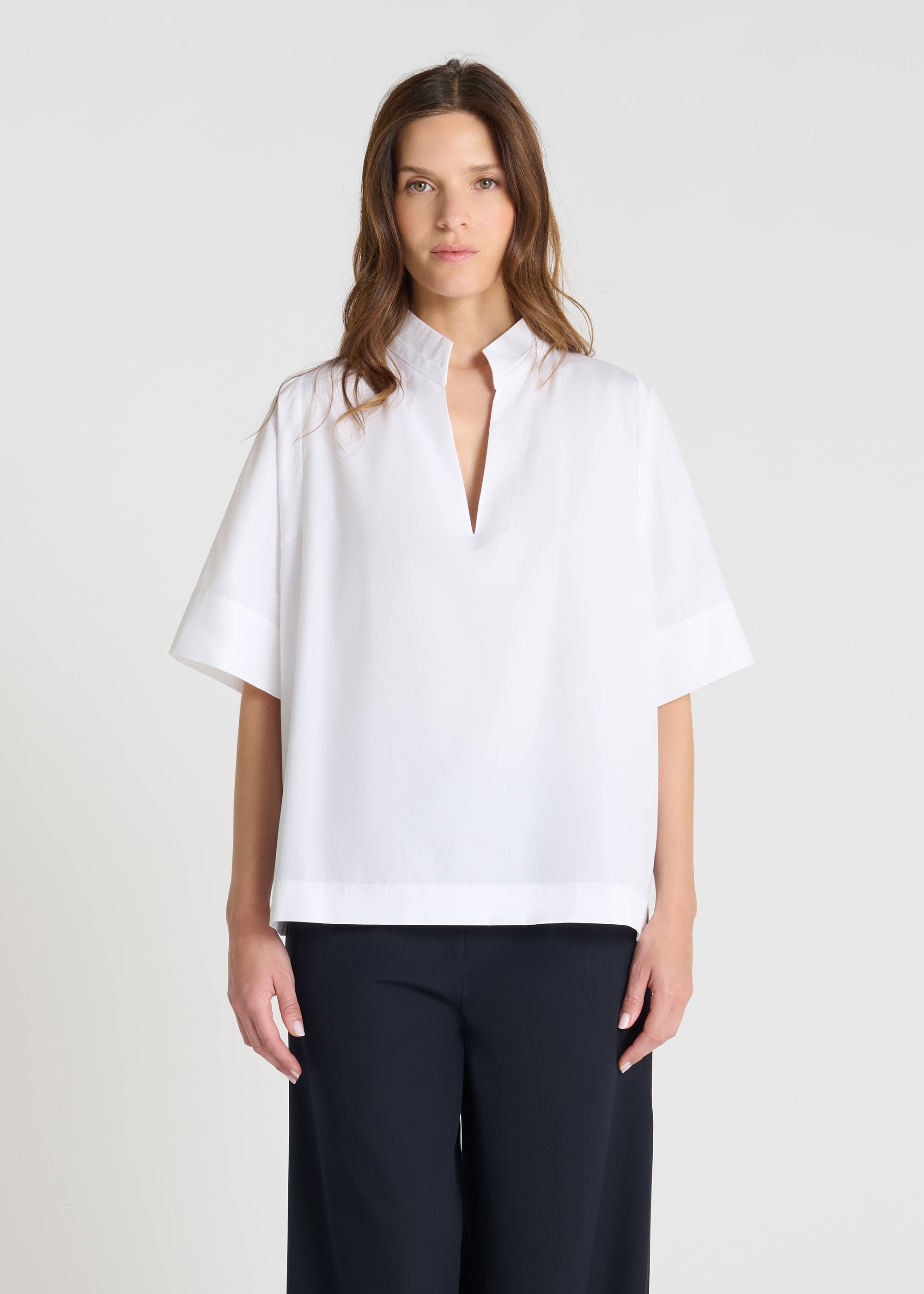 Confectionnée en popeline de coton, cette blouse femme séduit par sa légèreté et son confort au porté. Son col montant structuré par une baigneuse s’ouvre sur une encolure en V graphique qui structure la silhouette, tandis que les manches courtes, travaillées avec une fente, apportent du caractère. Le dos légèrement plus long finalise cette blouse au style net et contemporain.