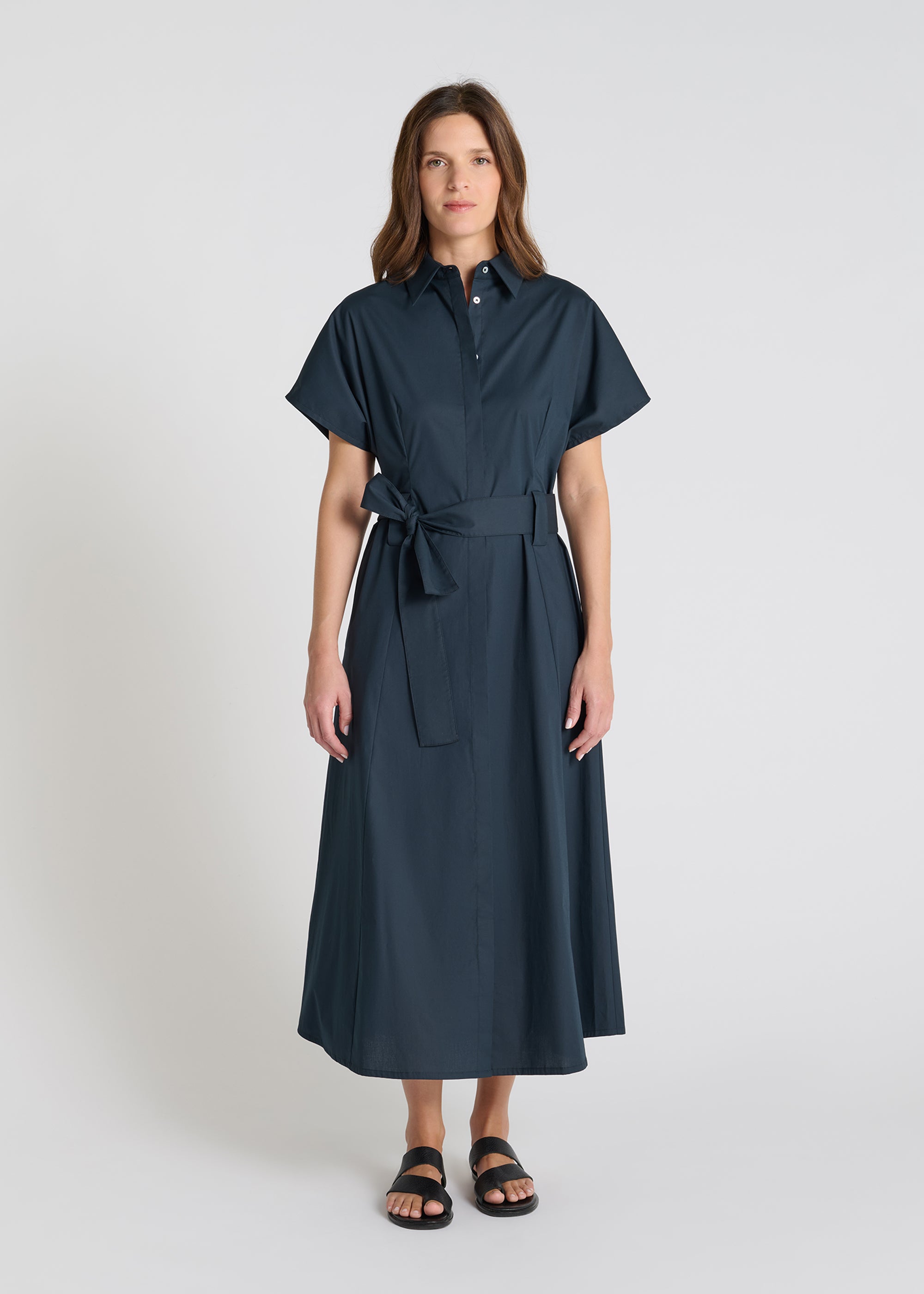 La robe Pervenche est réalisée en popeline stretch, offrant un tombé net et confortable.