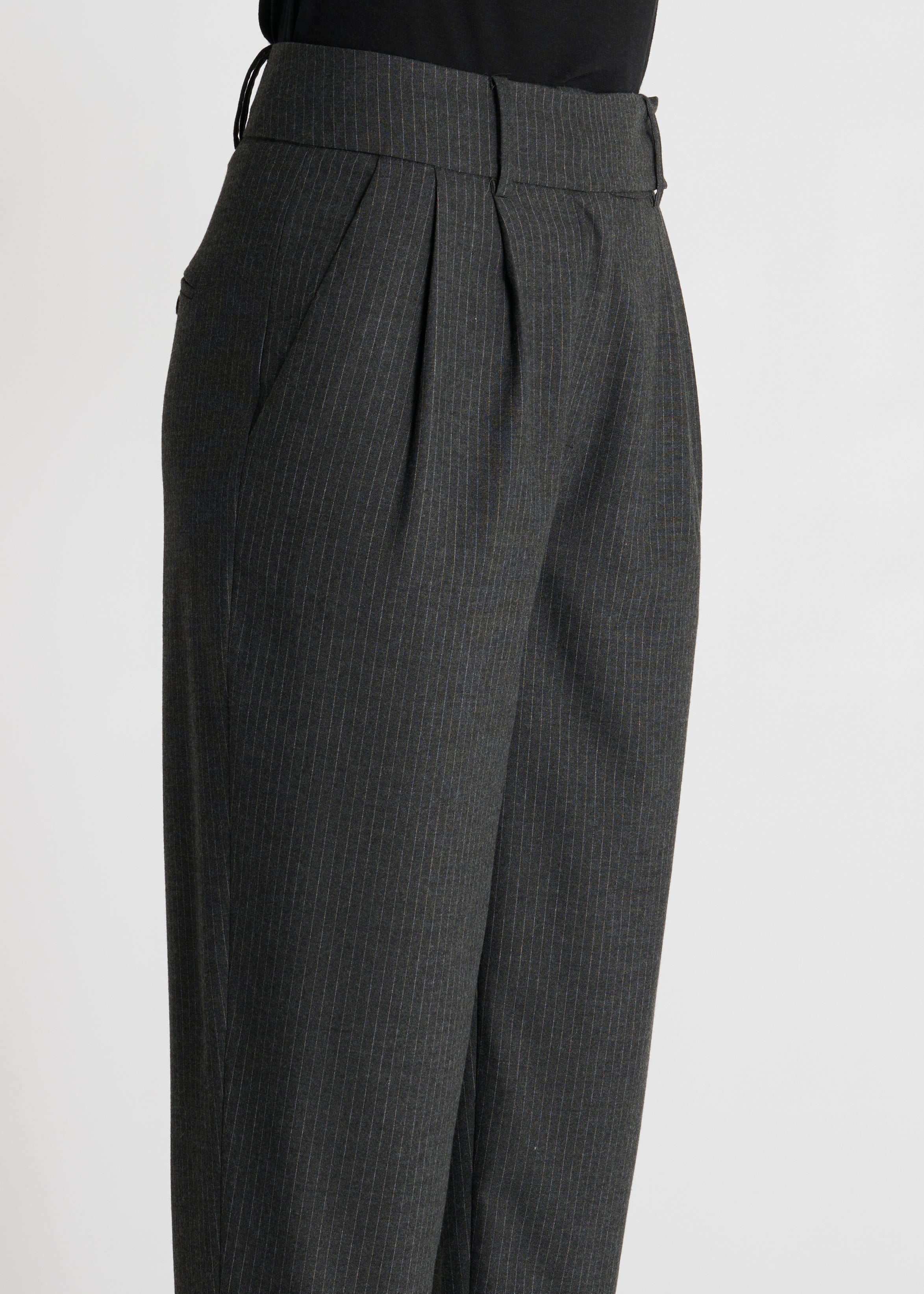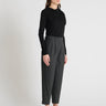 Sa taille haute et ses pinces marquées structurent le haut du corps, tandis que la jambe ample, fuselée vers le bas, crée un volume harmonieux et élégant. Ce jeu de proportions apporte une allure décontractée mais affirmée, caractéristique de la maison.