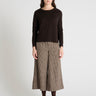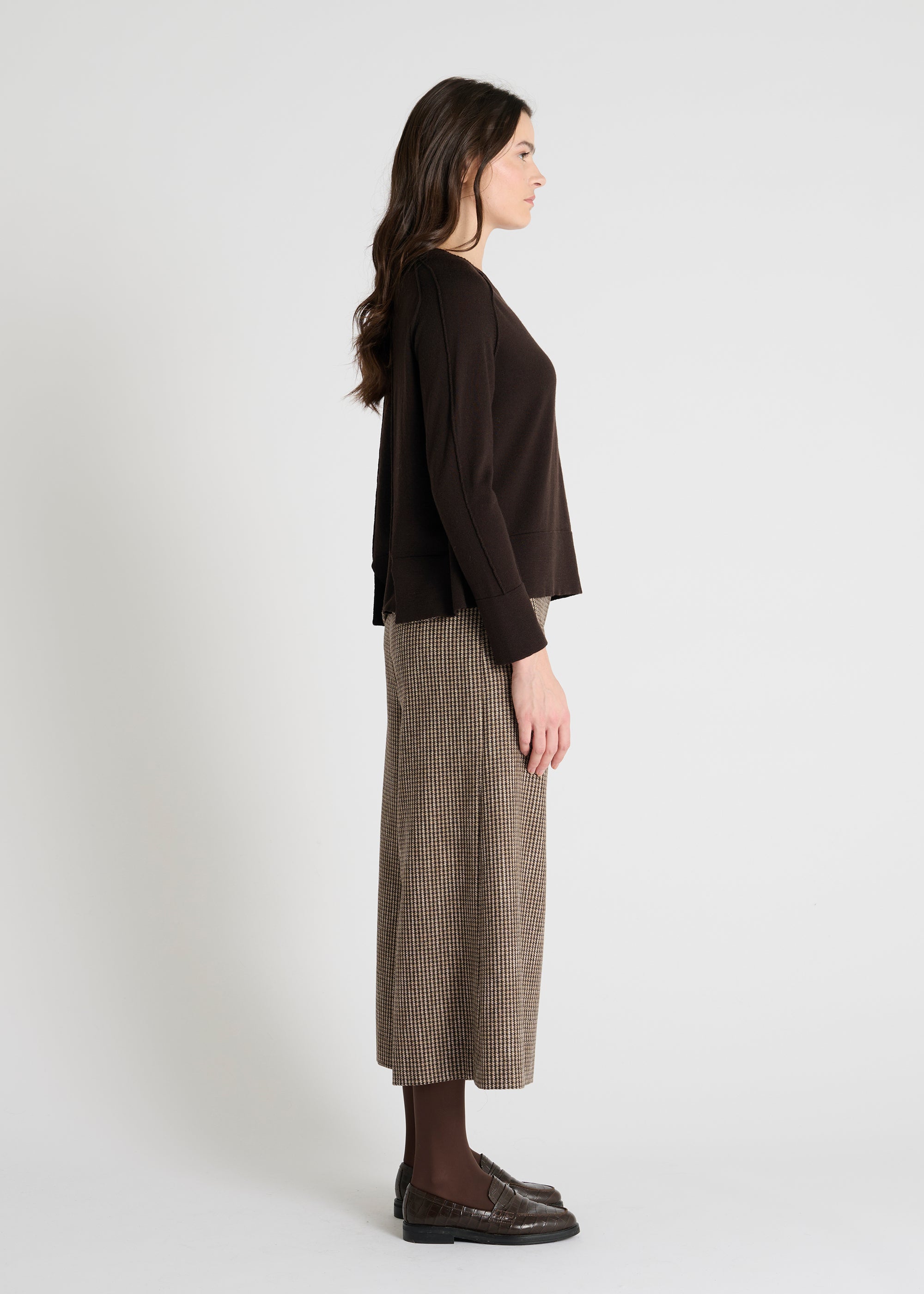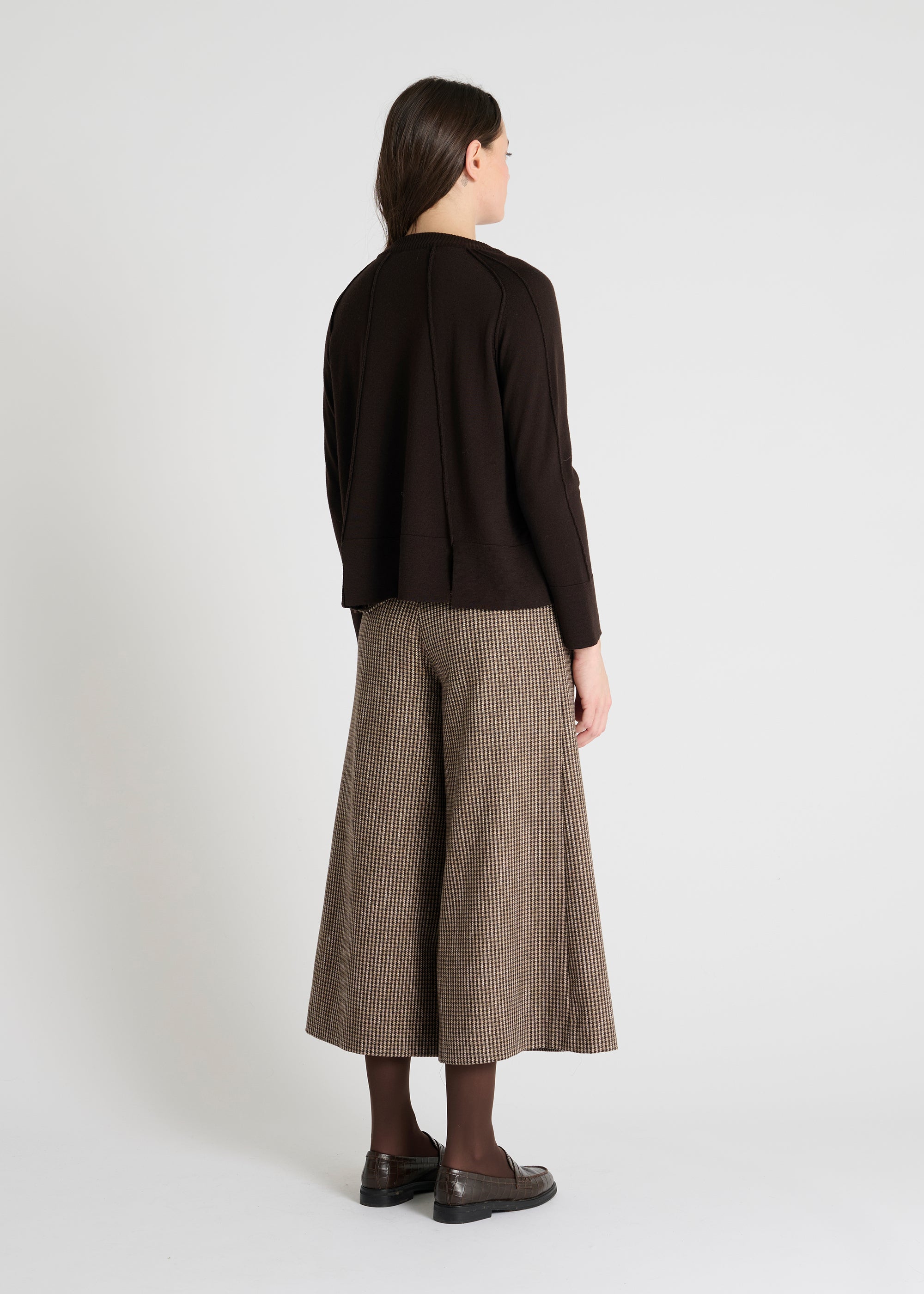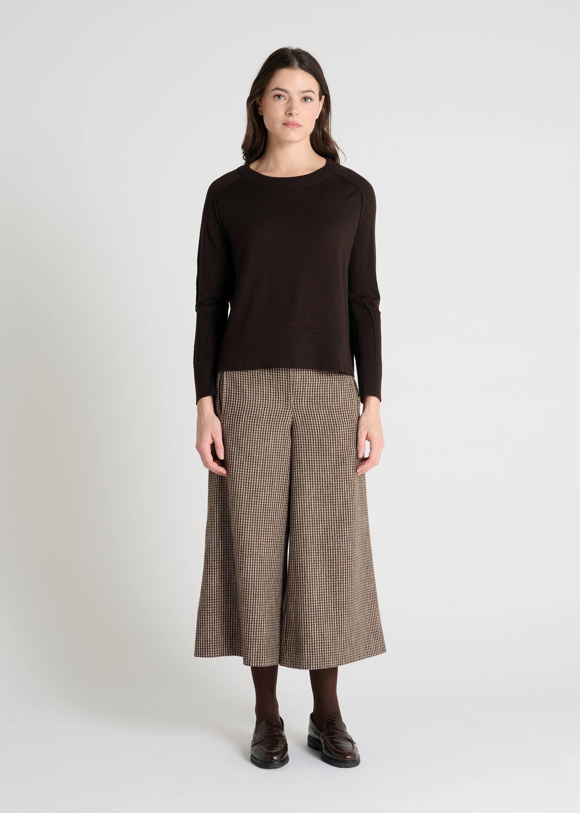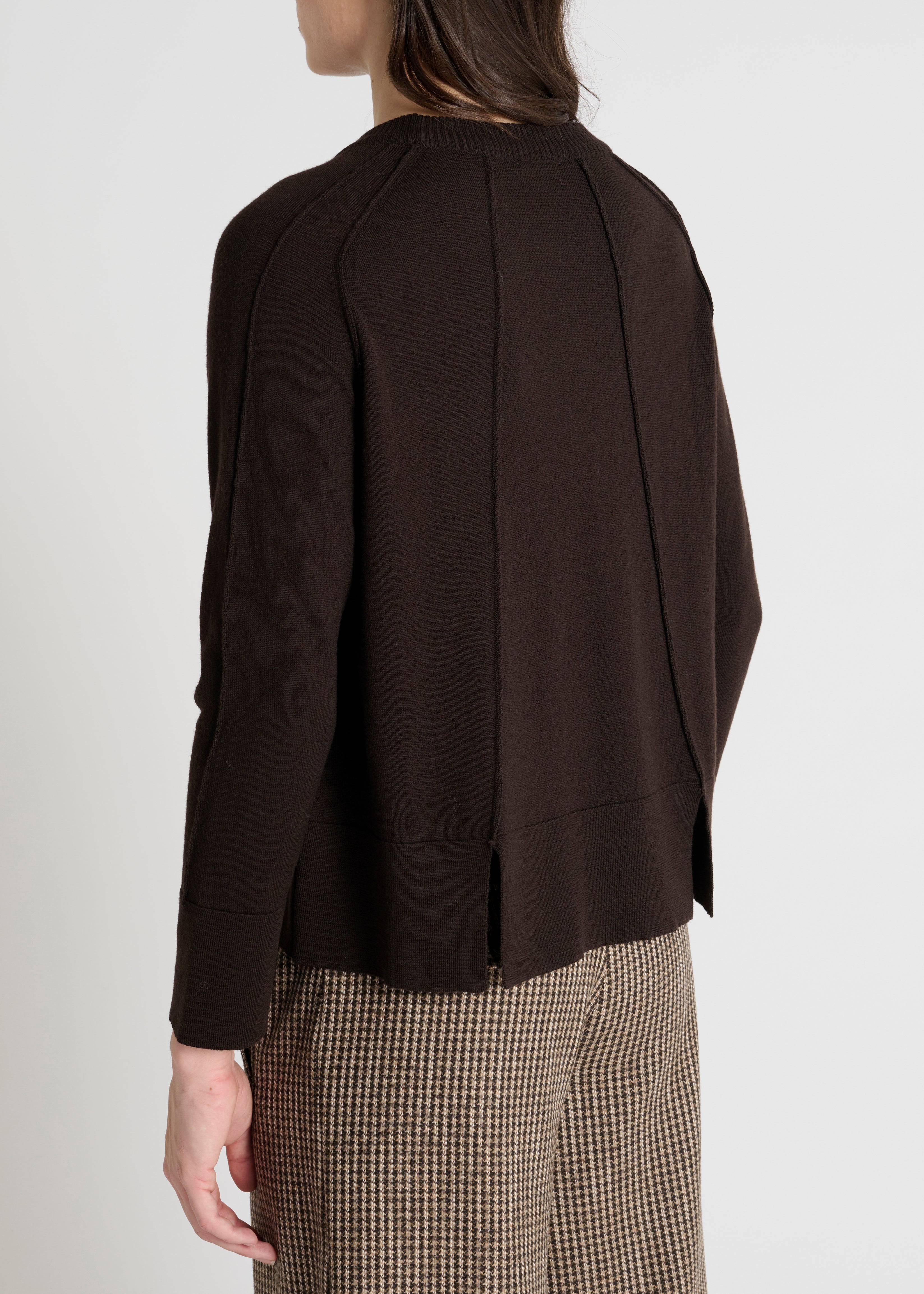 Avec sa maille mérinos 1 fil, Tupac choco joue sur une construction sobre relevée de détails graphiques. Son volume droit est ponctué de nervures apparentes dans le dos, terminées par de petites fentes discrètes. L’encolure ronde, les poignets et le bas sont soulignés par un bord-côte. Les manches longues et l’emmanchure marteau structurent l’ensemble avec justesse.