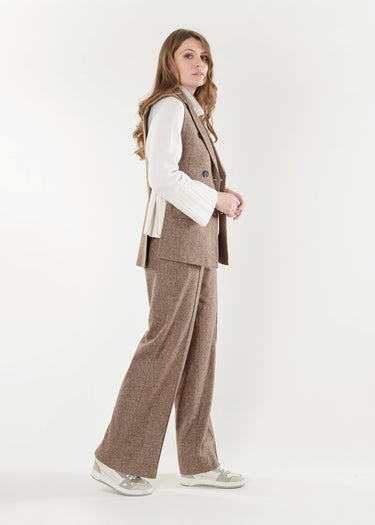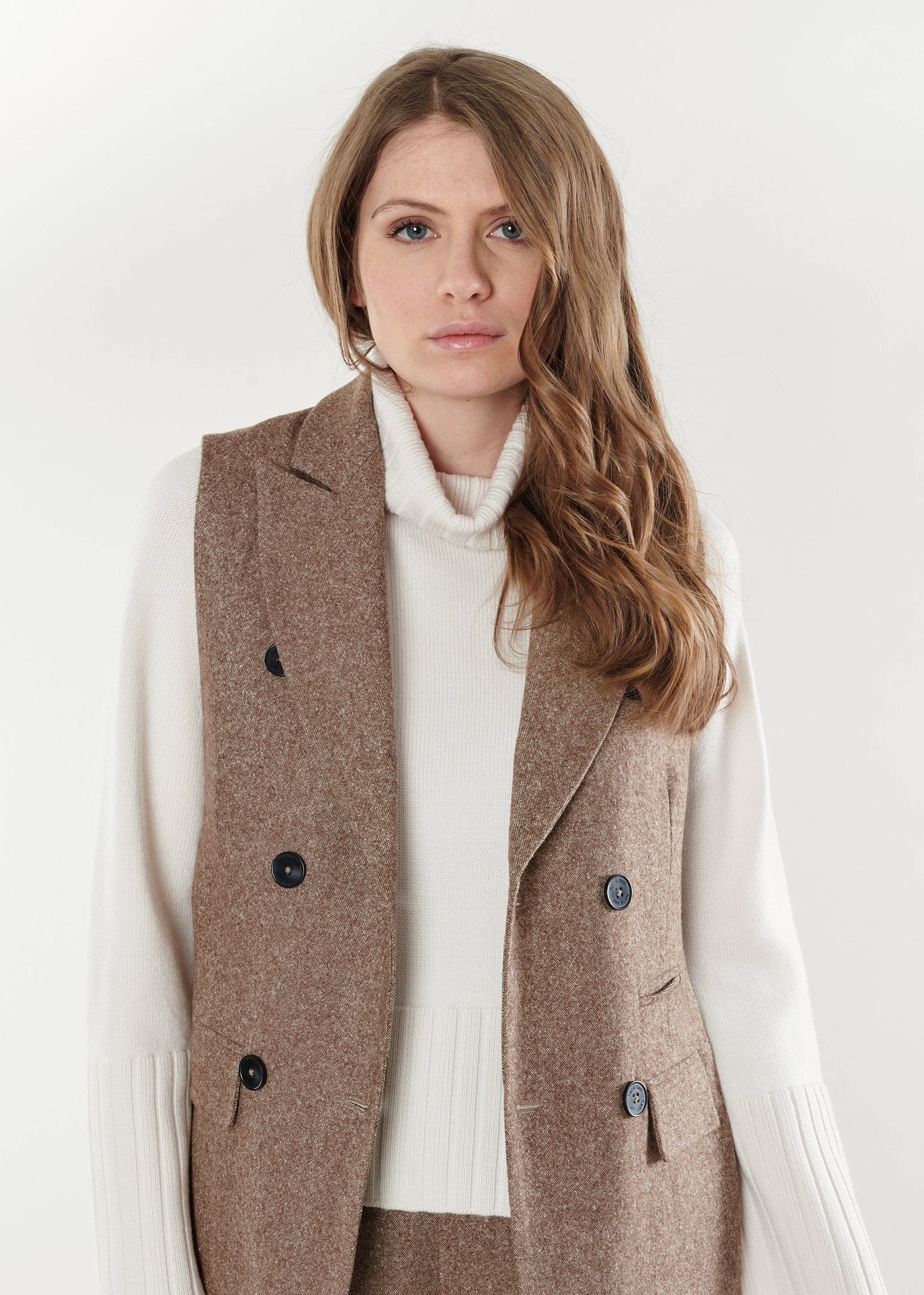 D’inspiration blazer, il reprend les codes d’une veste mouchetée sans manche : col tailleur élégant, fermeture par 6 boutons en corozo, rabats de poches sur le devant agrémentés de passepoil, découpes profilées dans le dos et base droite doublée.