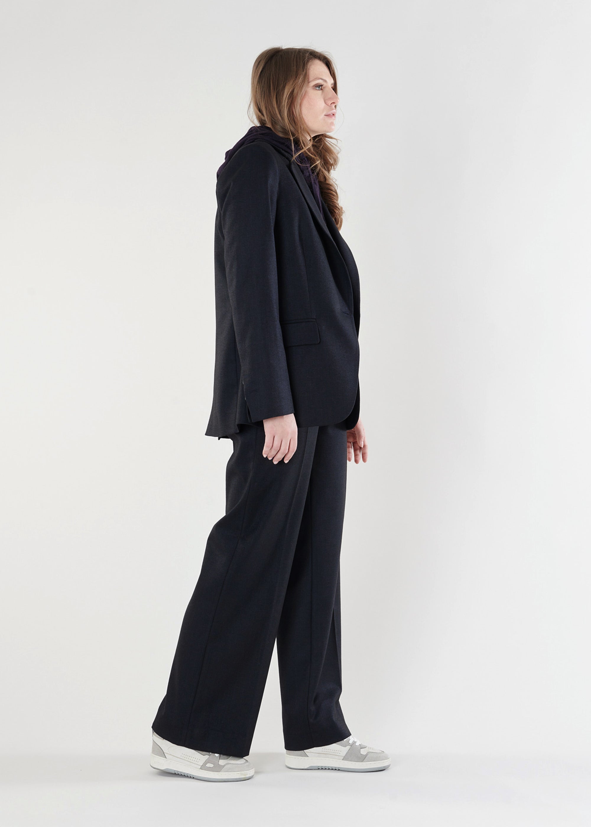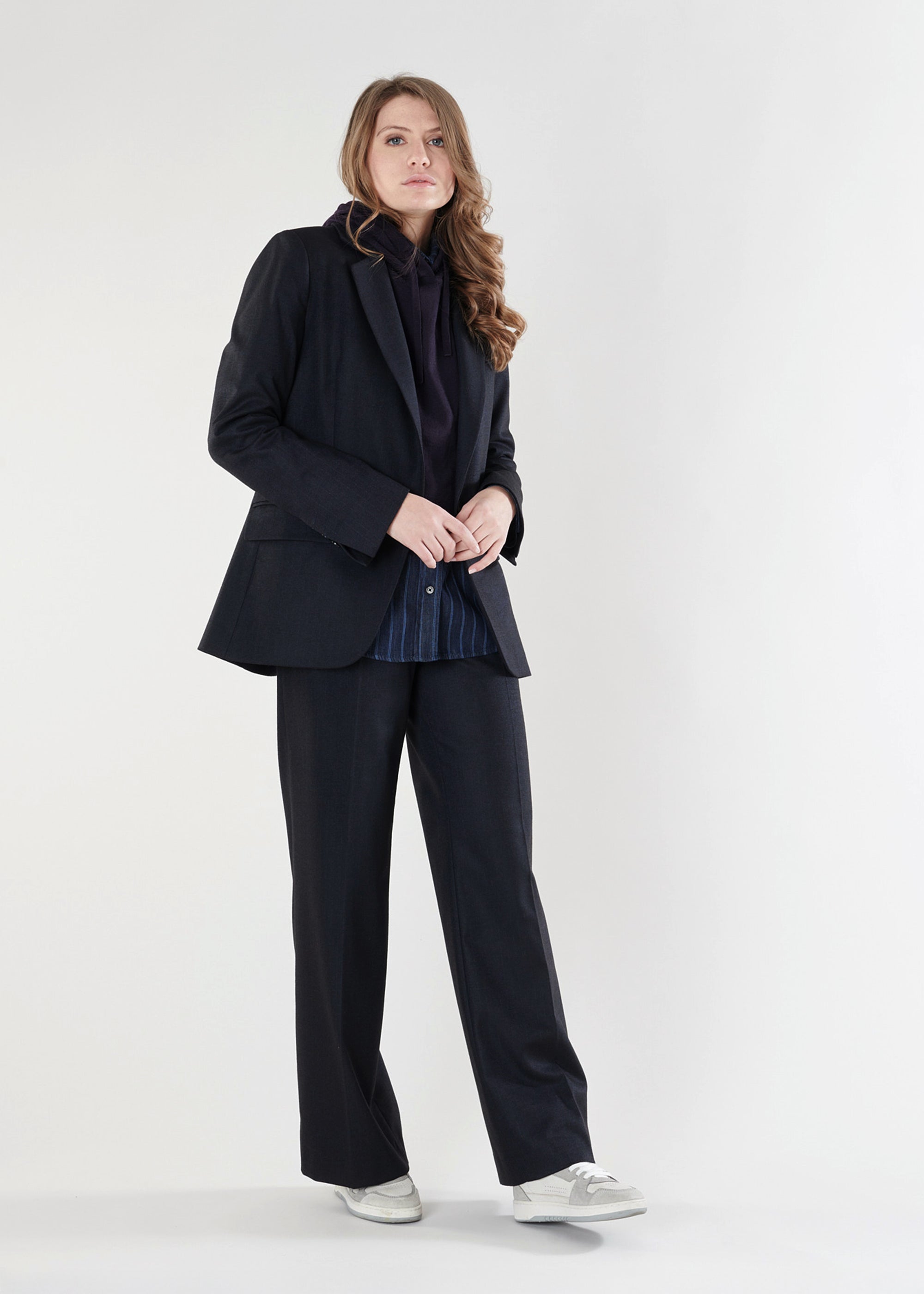 Le modèle Gertrude se dévoile dans une somptueuse couleur bleu nuit, une veste blazer à l’allure raffinée confectionnée dans une flanelle rayée d’une grande douceur.