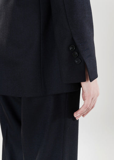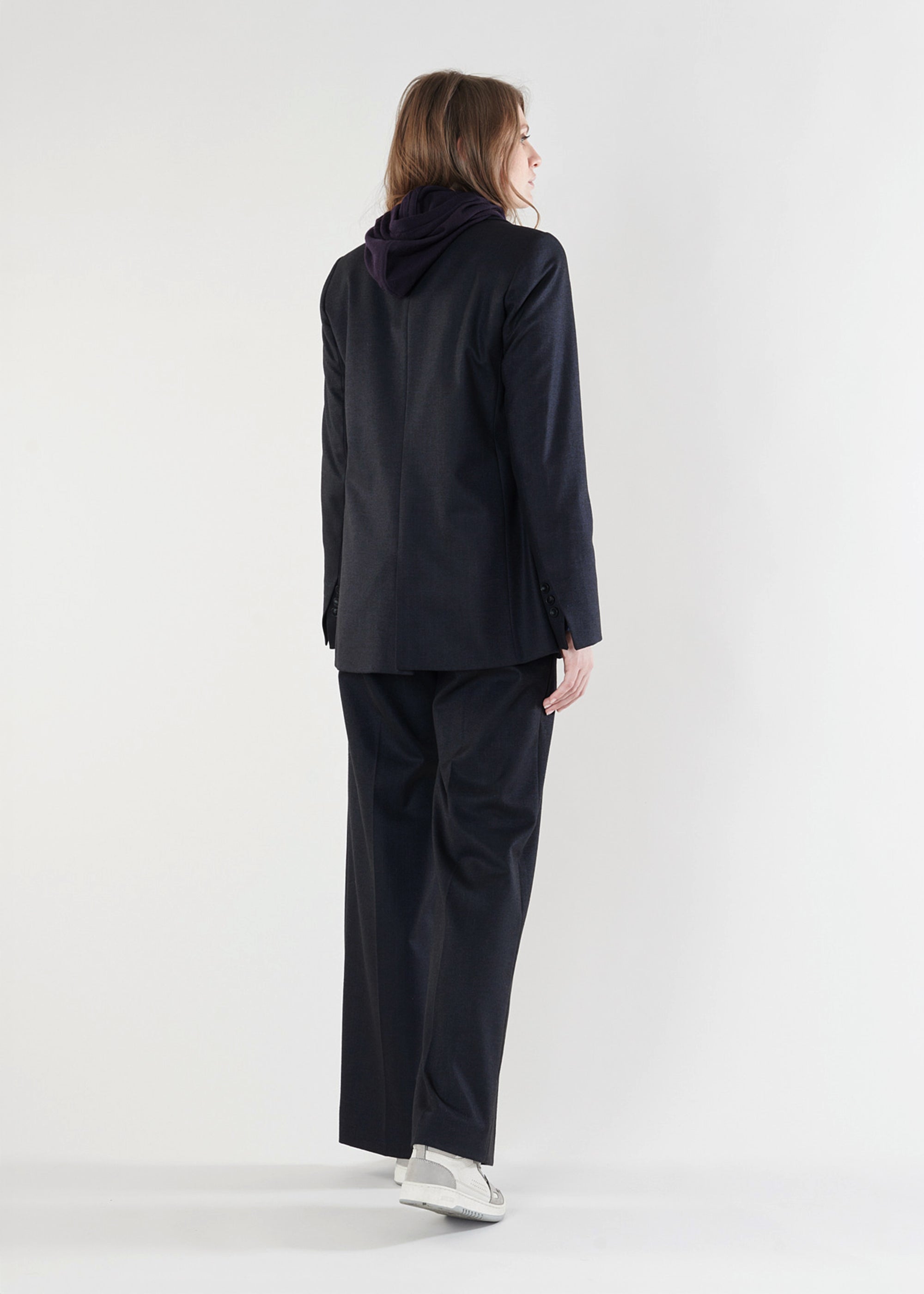 Son col tailleur se ferme avec un bouton en corozo, apportant une touche naturelle et subtilement sophistiquée. Les rabats de poches sur le devant soulignent son élégance structurée, tandis que les découpes dans le dos offrent une ligne impeccable. Les manches, finies par trois boutons et une fente délicate, ajoutent à son charme tailleur. La base droite doublée parachève cette pièce intemporelle, parfaite pour une silhouette chic et harmonieuse.