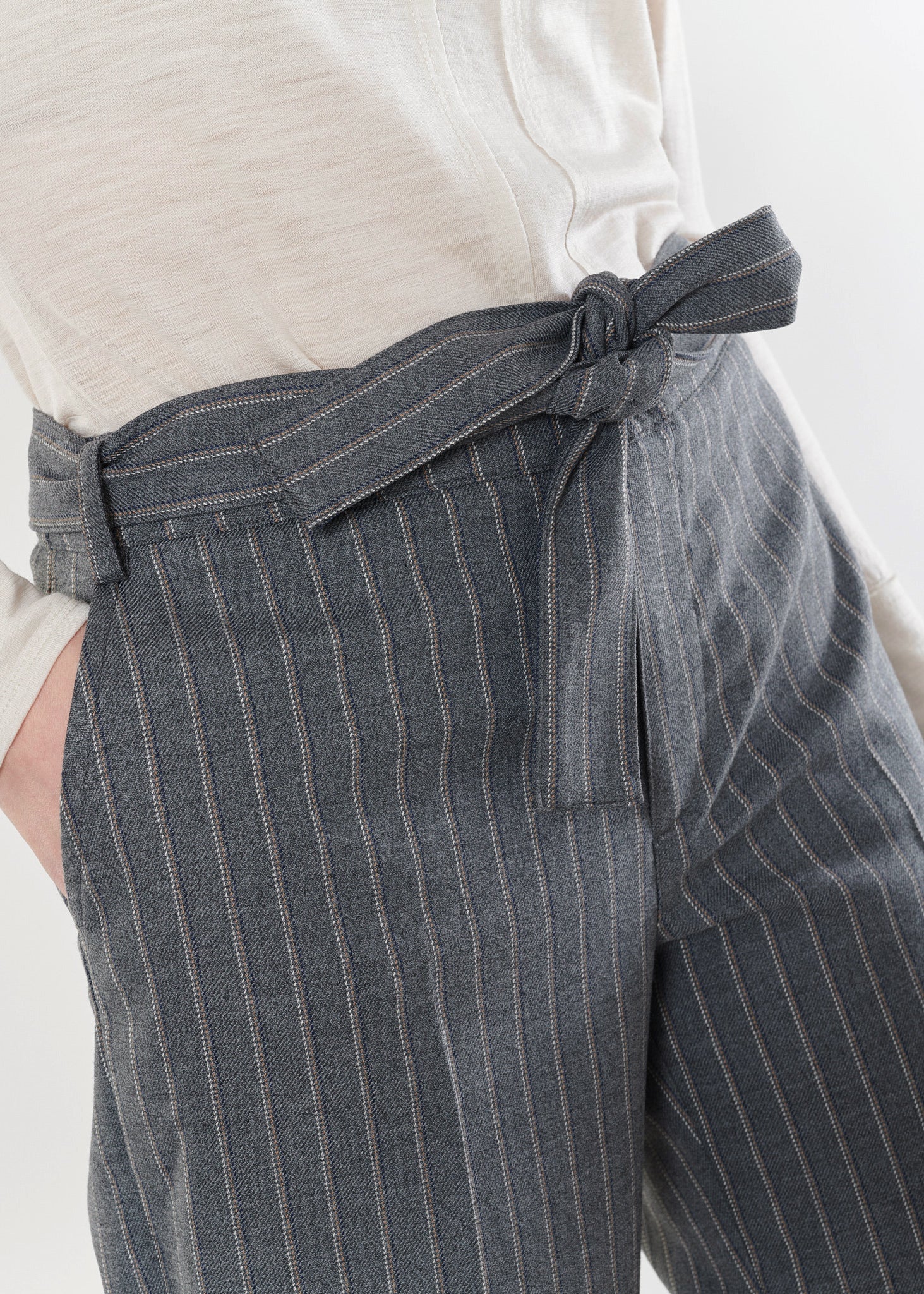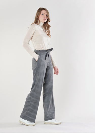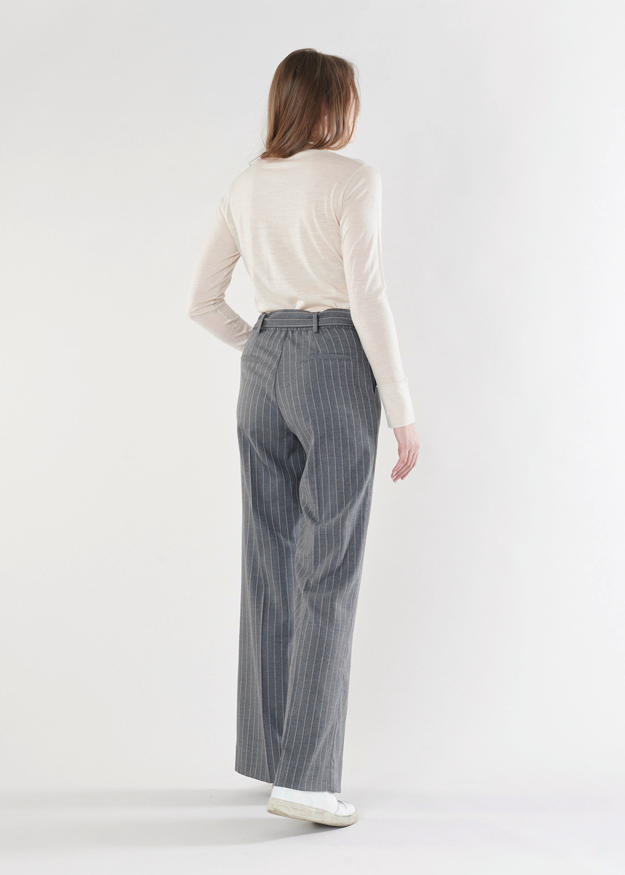 The Maike trousers offer a fresh take on tailoring with a fluid, modern silhouette. Their gathered elasticated waist provides comfort and support, accentuated by a tie that structures the figure. The wide, straight cut naturally elongates the leg, a feature highly valued in women's wide-leg trousers and comfortable high-waisted trousers.