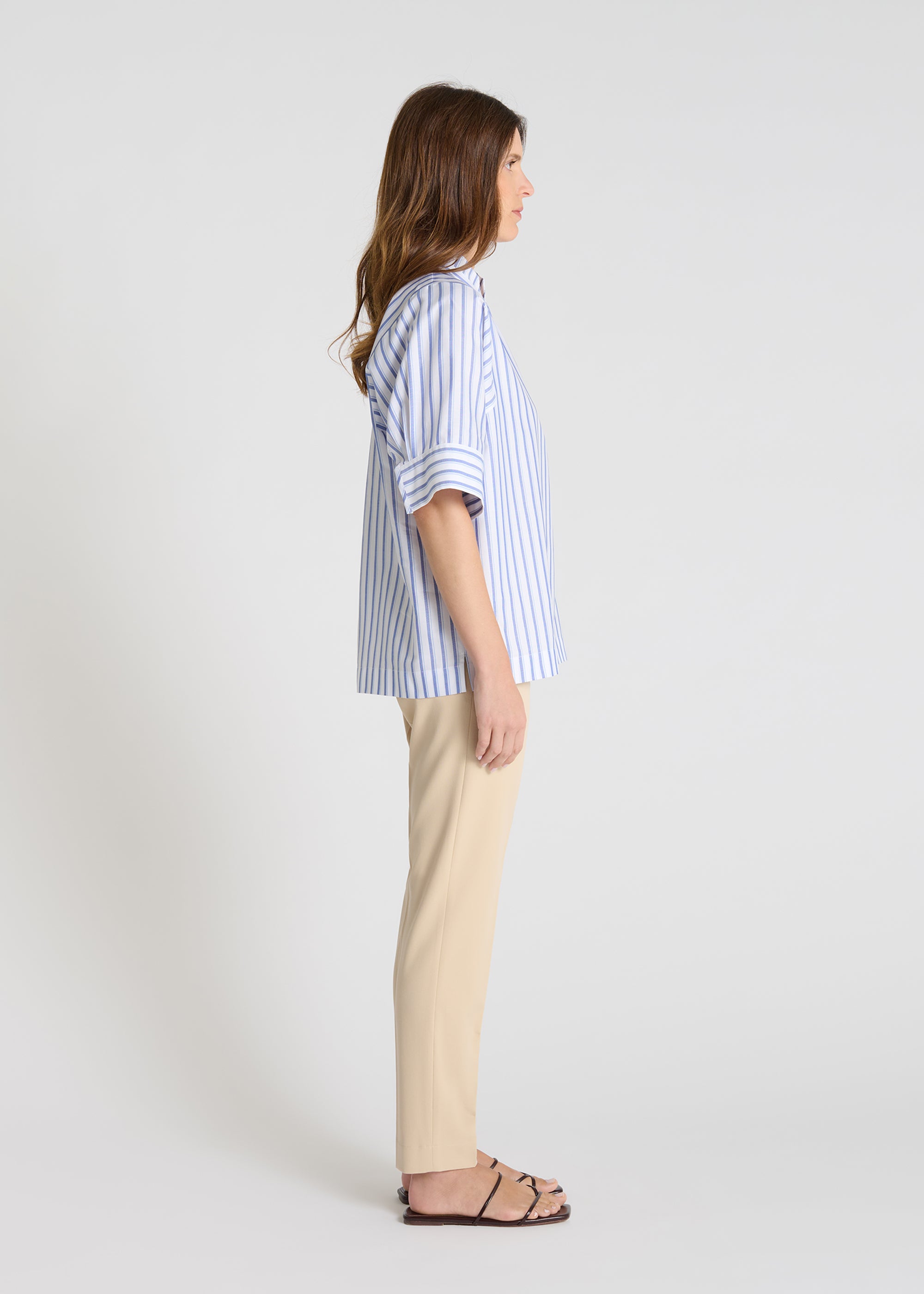 The short sleeves, finished with a slit, enhance the character of the design. The straight hem completes this striped blouse with its clean and sophisticated style.