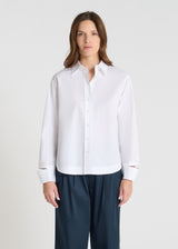Crafted from cotton poplin, the Dahlia shirt captivates with its straight, slightly flared silhouette and fluid drape. Its carefully structured collar elegantly frames the neckline, while the exposed button placket reveals engraved mother-of-pearl buttons, adding a luminous and refined touch. The long sleeves draw the eye with their horizontally split cuffs, a graphic detail that allows for freedom of movement and defines the silhouette with a modern edge. A cotton shirt designed as an essential piece, where the cut and finishing make all the difference.