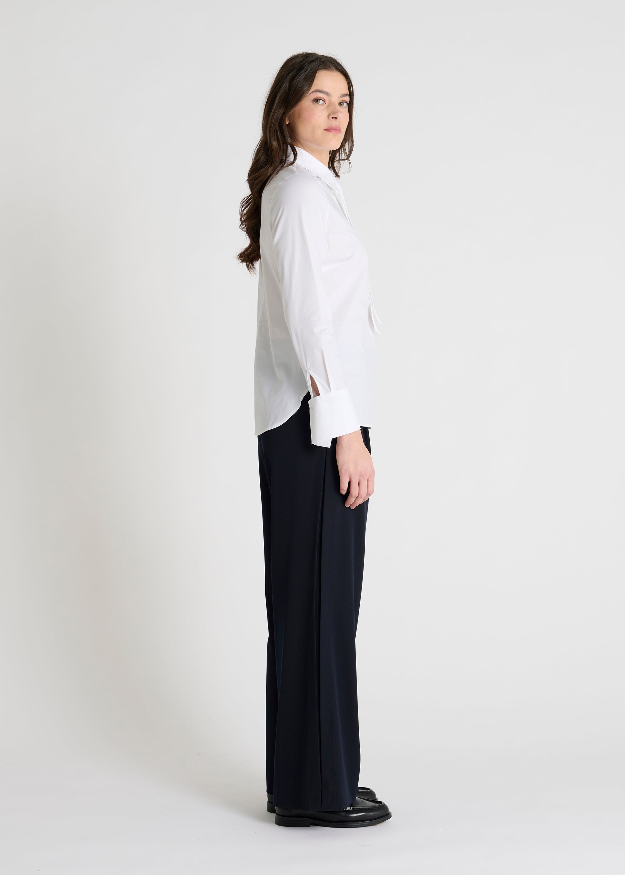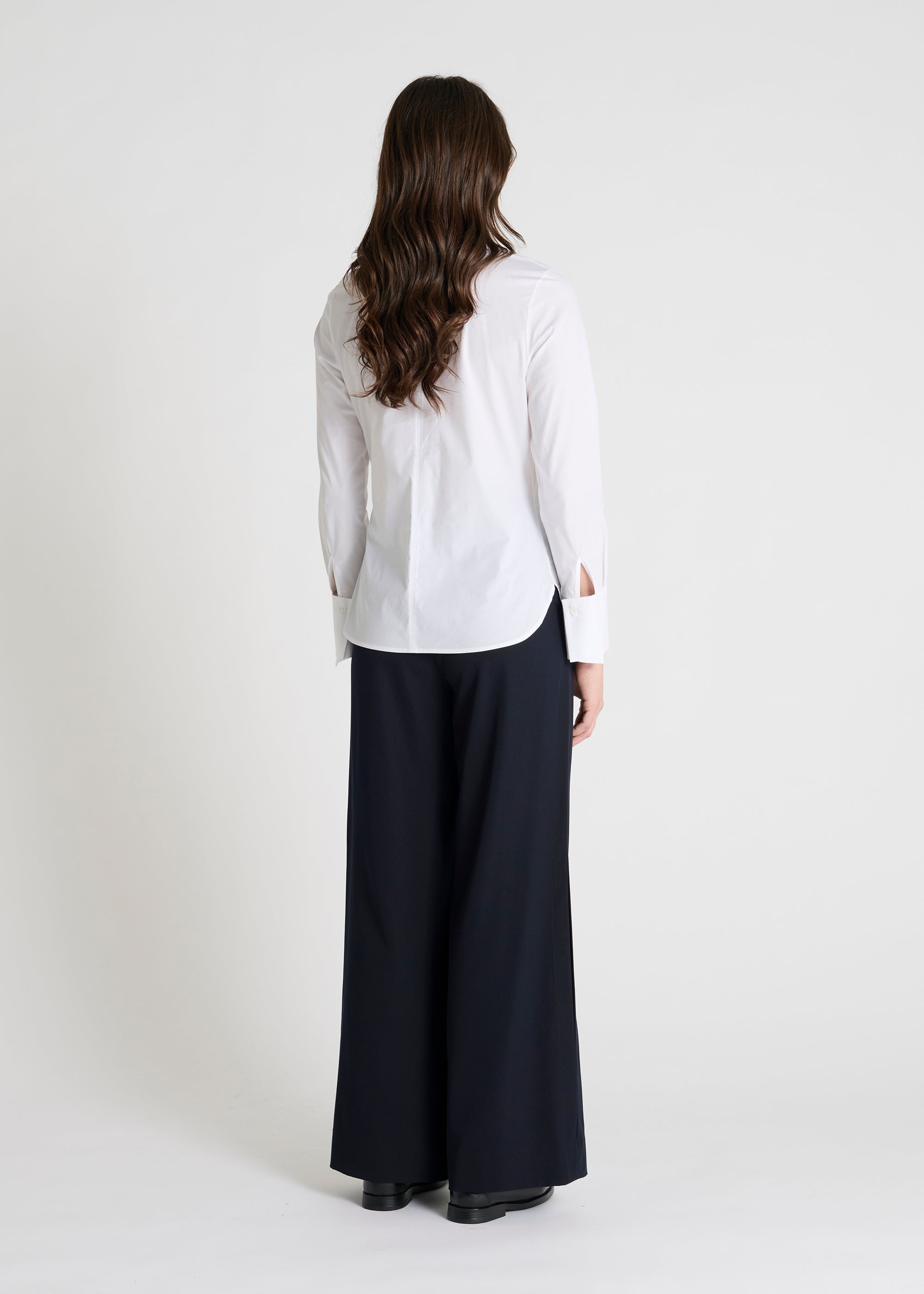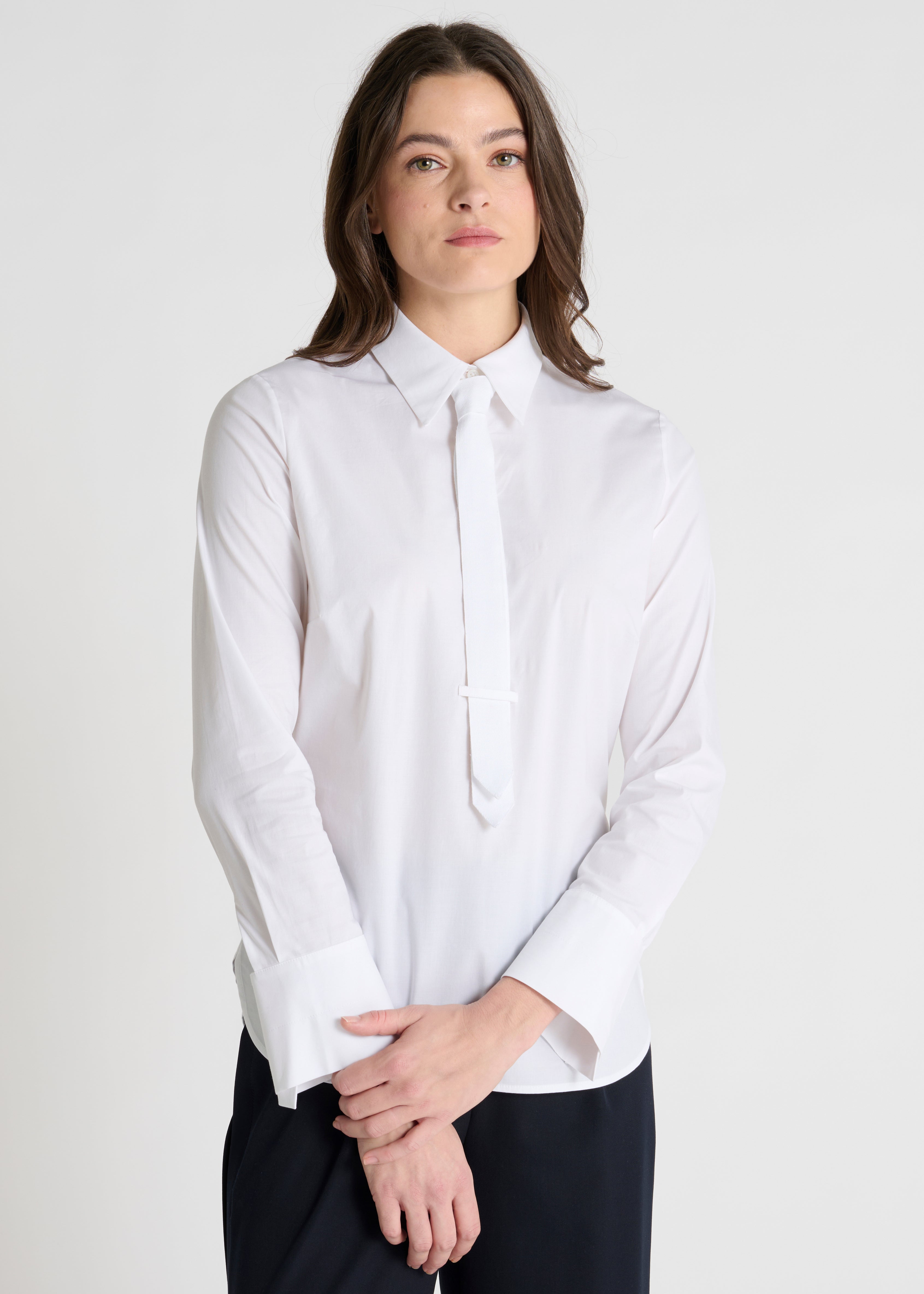 Crafted from a plain stretch poplin, the Ilva shirt combines elegance and comfort. Its detachable lavallière tie allows you to personalize your look, while its chest darts ensure a flattering, fitted cut. The collar, fastened with six mother-of-pearl buttons concealed beneath a placket, adds a touch of refinement. The long sleeves feature pre-shaped pleats at the cuffs, providing a neat and structured detail. The shirt's straight cut and rounded hem with side vents create a modern silhouette.