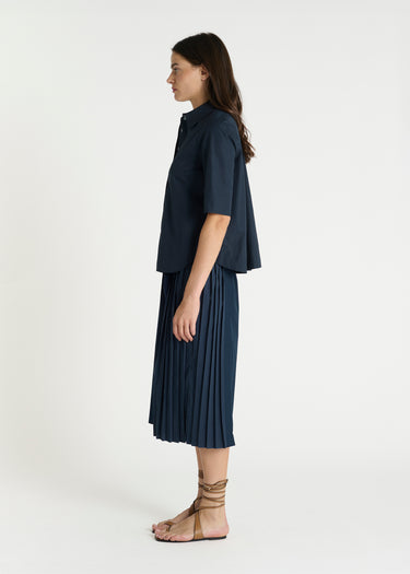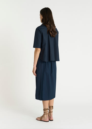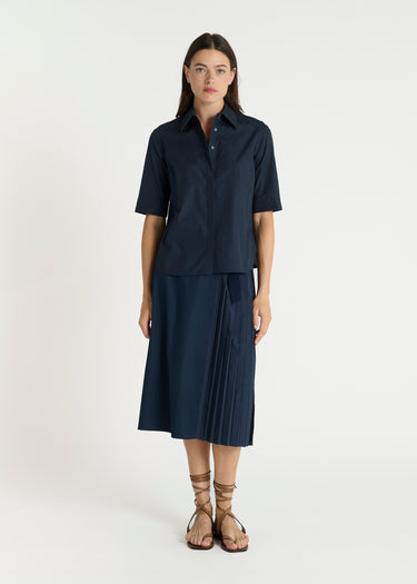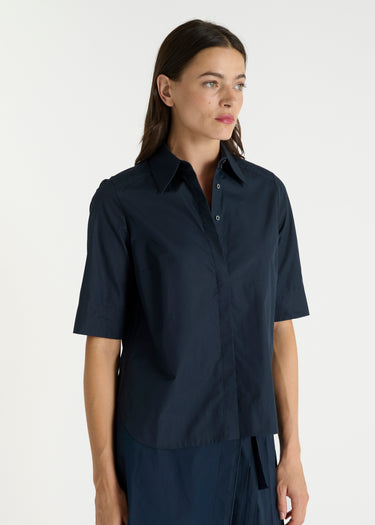 Discover Isabella, a cotton poplin shirt with a sleek design. Its collar, fastened with nine discreetly hidden natural mother-of-pearl buttons, offers a simple and elegant look. It features short sleeves and a distinctive cutout at the back. Its straight cut extends elegantly down the back.