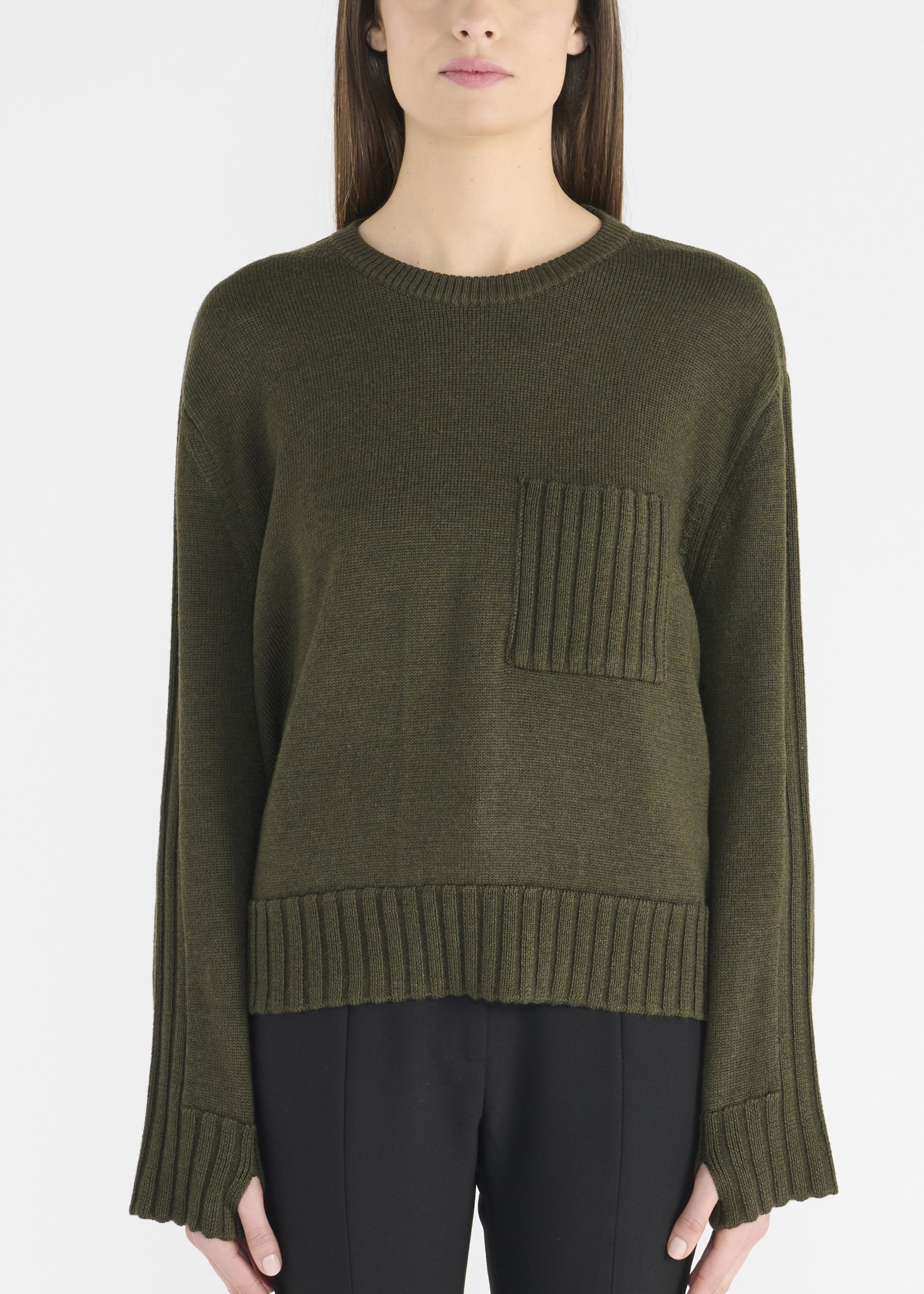 Son col rond classique se marie parfaitement avec la poche poitrine plaquée et les bandes en côtes épaisses sur les manches et le dos, apportant texture et élégance. Les trous pour les pouces aux manches ajoutent une touche pratique et moderne, tandis que la base droite assure un tombé impeccable.