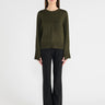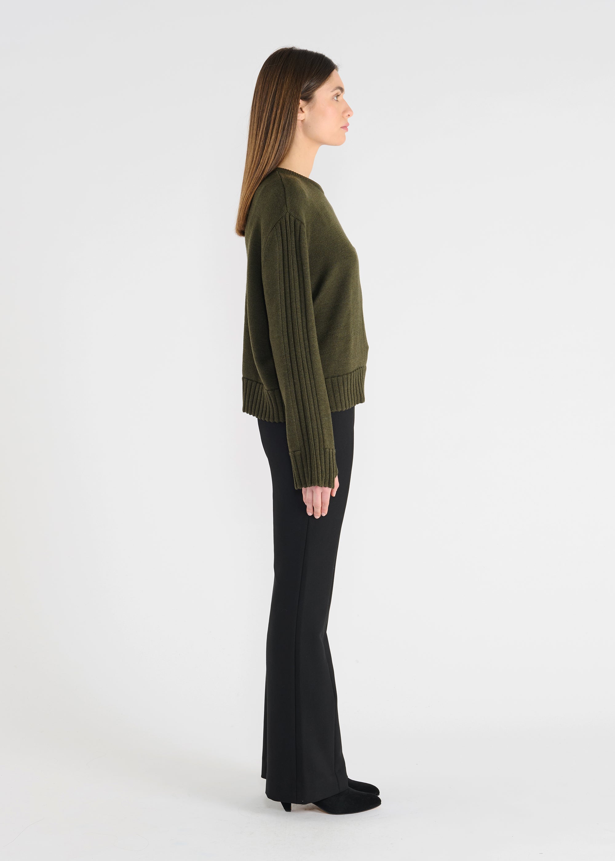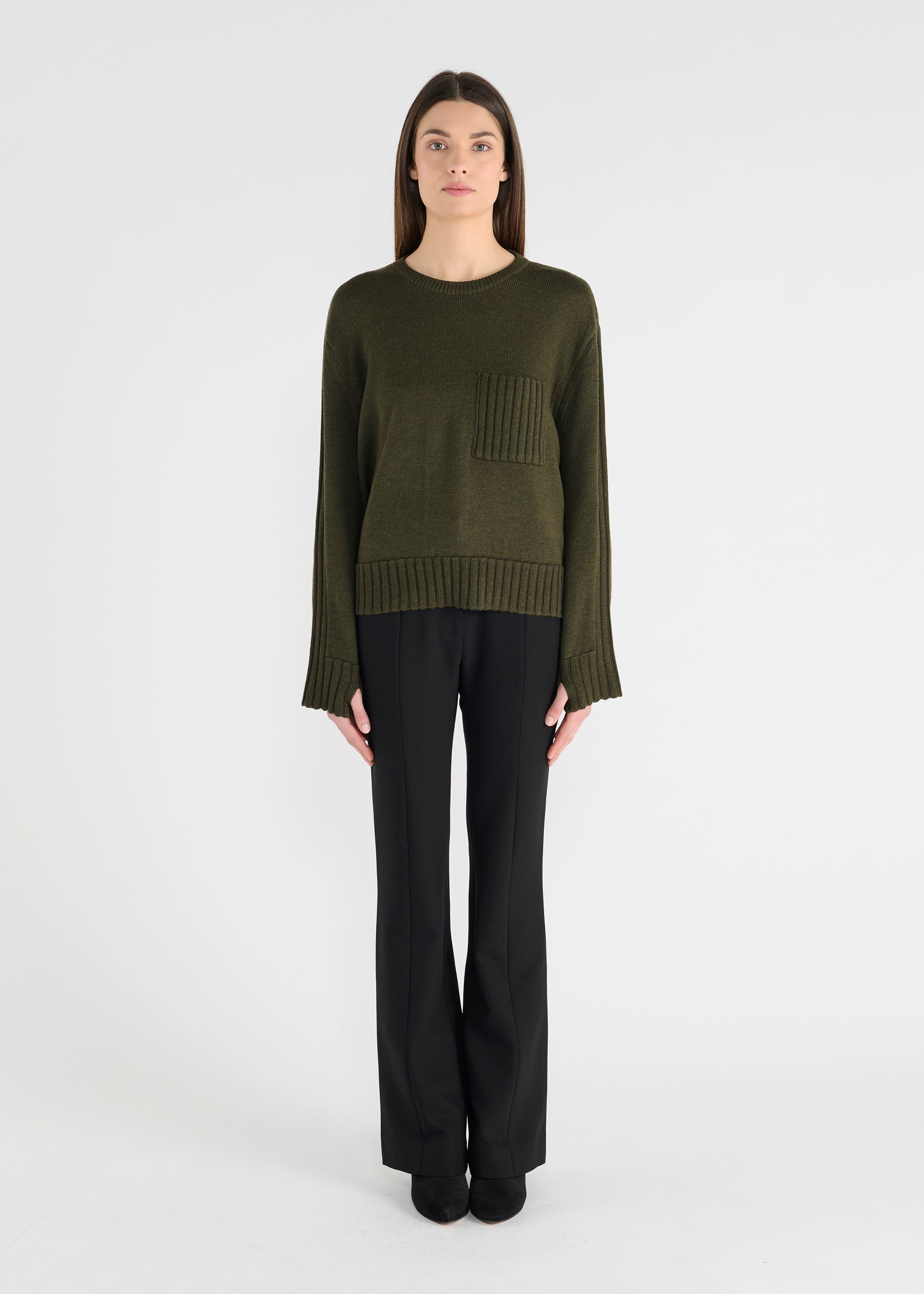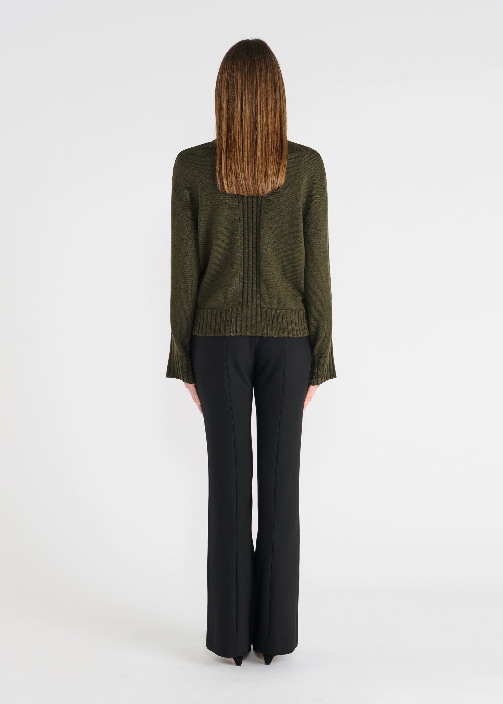 Le pull Claudio kaki, tricoté en laine mérinos trois fils de haute qualité, allie confort et style raffiné pour une allure chic et relax.