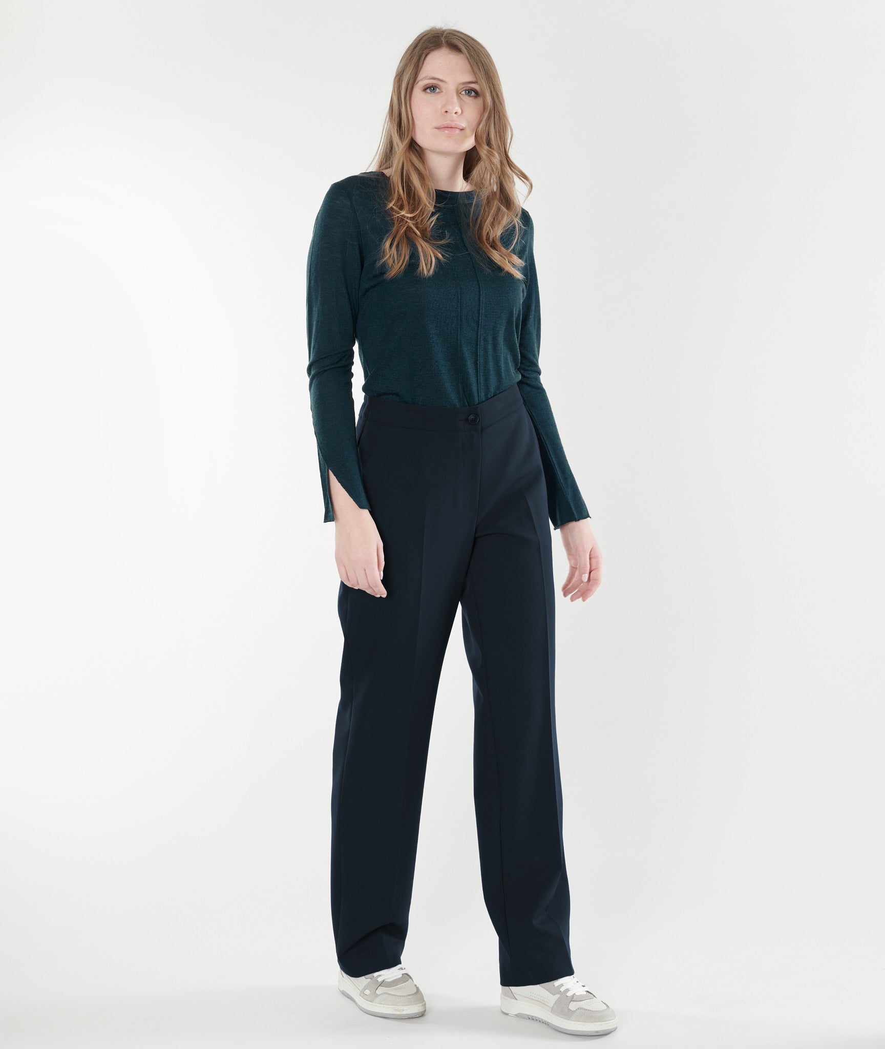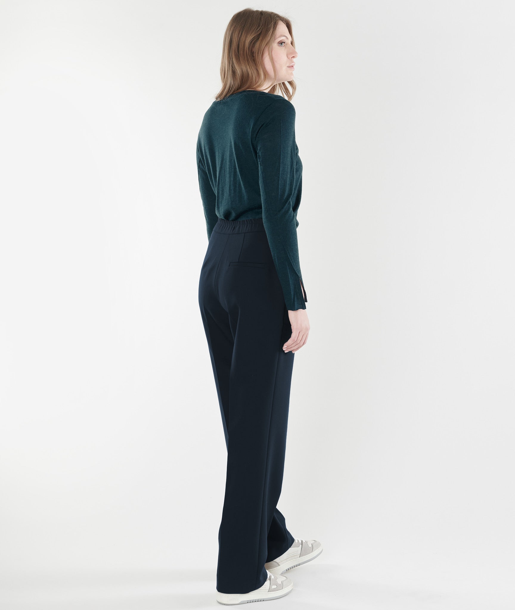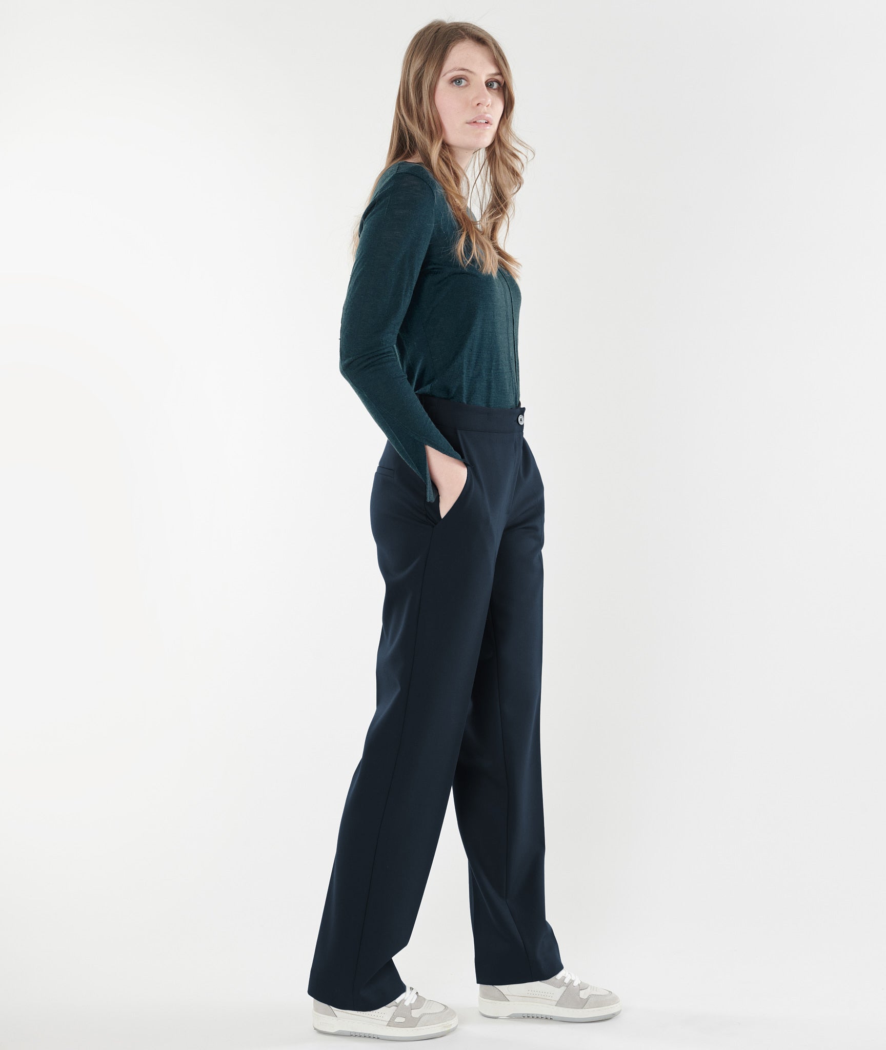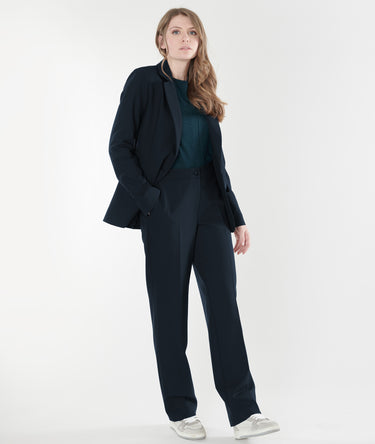 Timeless elegance defines these straight-leg trousers in a deep midnight blue. A button-front closure and discreet elasticated waistband ensure an effortless fit. Flattering slanted pockets and a flared cut elongate the silhouette. A wardrobe staple, both essential and refined.
