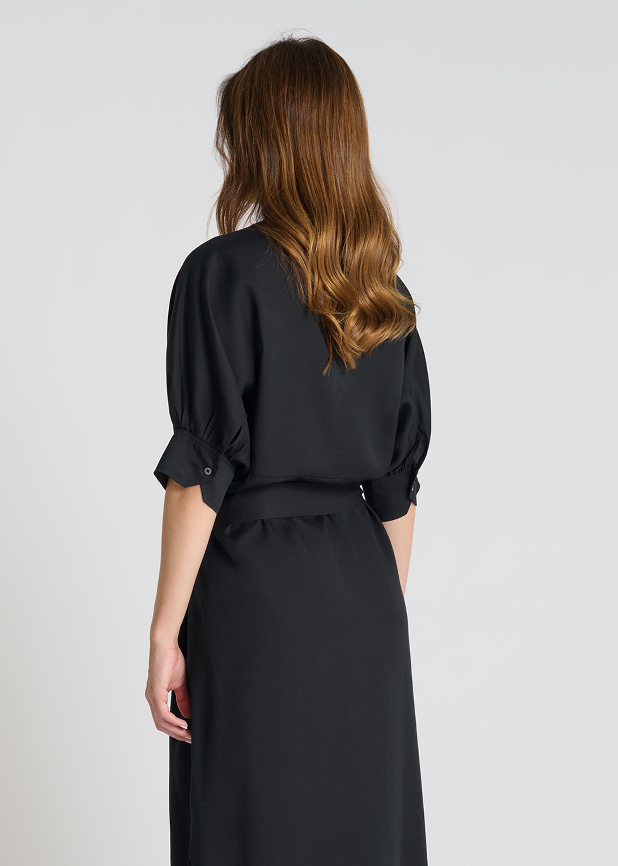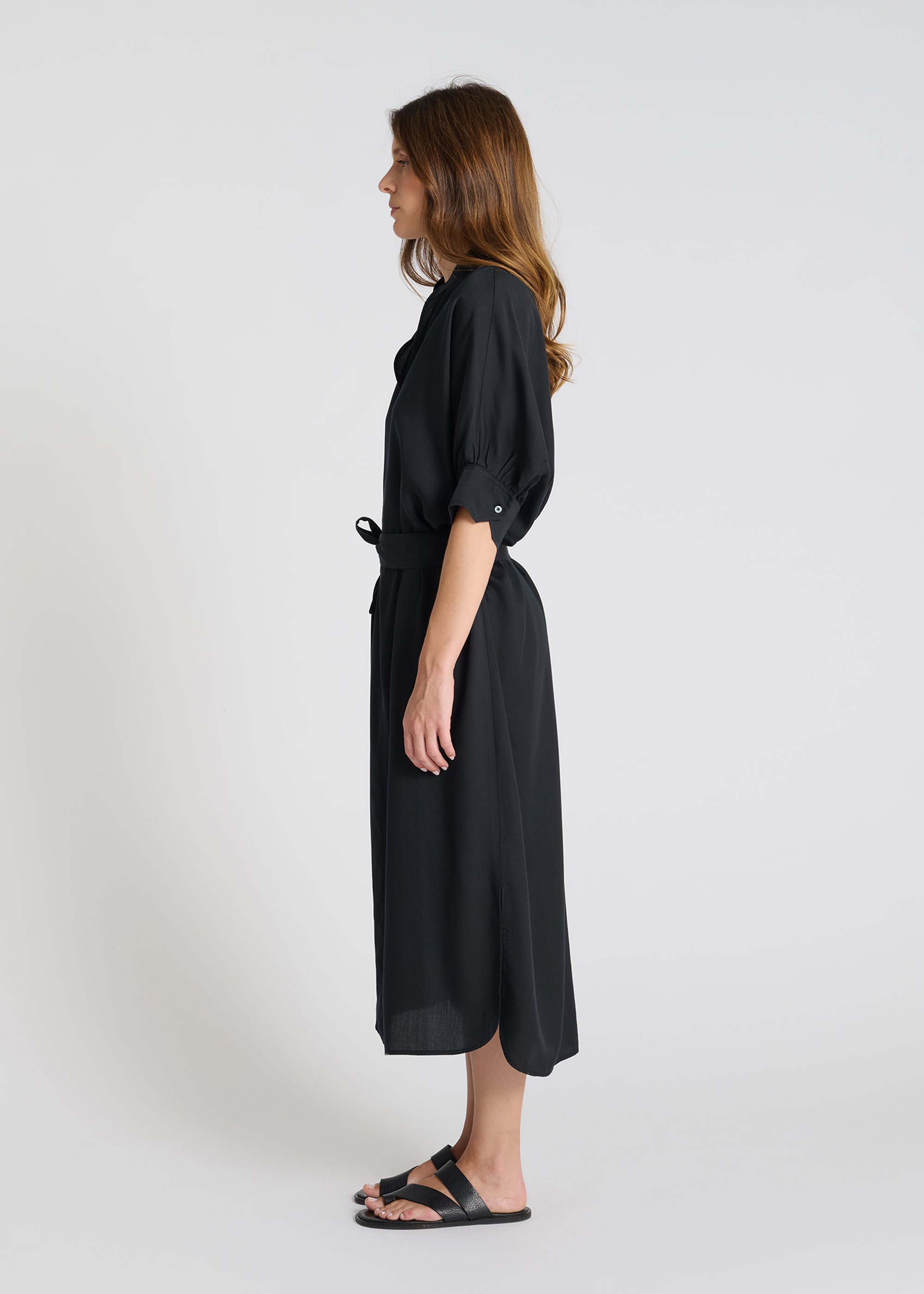 Made from 100% Tencel, the Hoya dress offers a fluid and natural drape. Its long cut is structured by a removable belt, allowing you to adjust the silhouette as desired. The slightly open neckline adds softness to the wear, while the short sleeves fasten with mother-of-pearl buttons at the hem, a discreet and refined detail. An easy-to-wear dress that moves with you and adapts to any time of day.