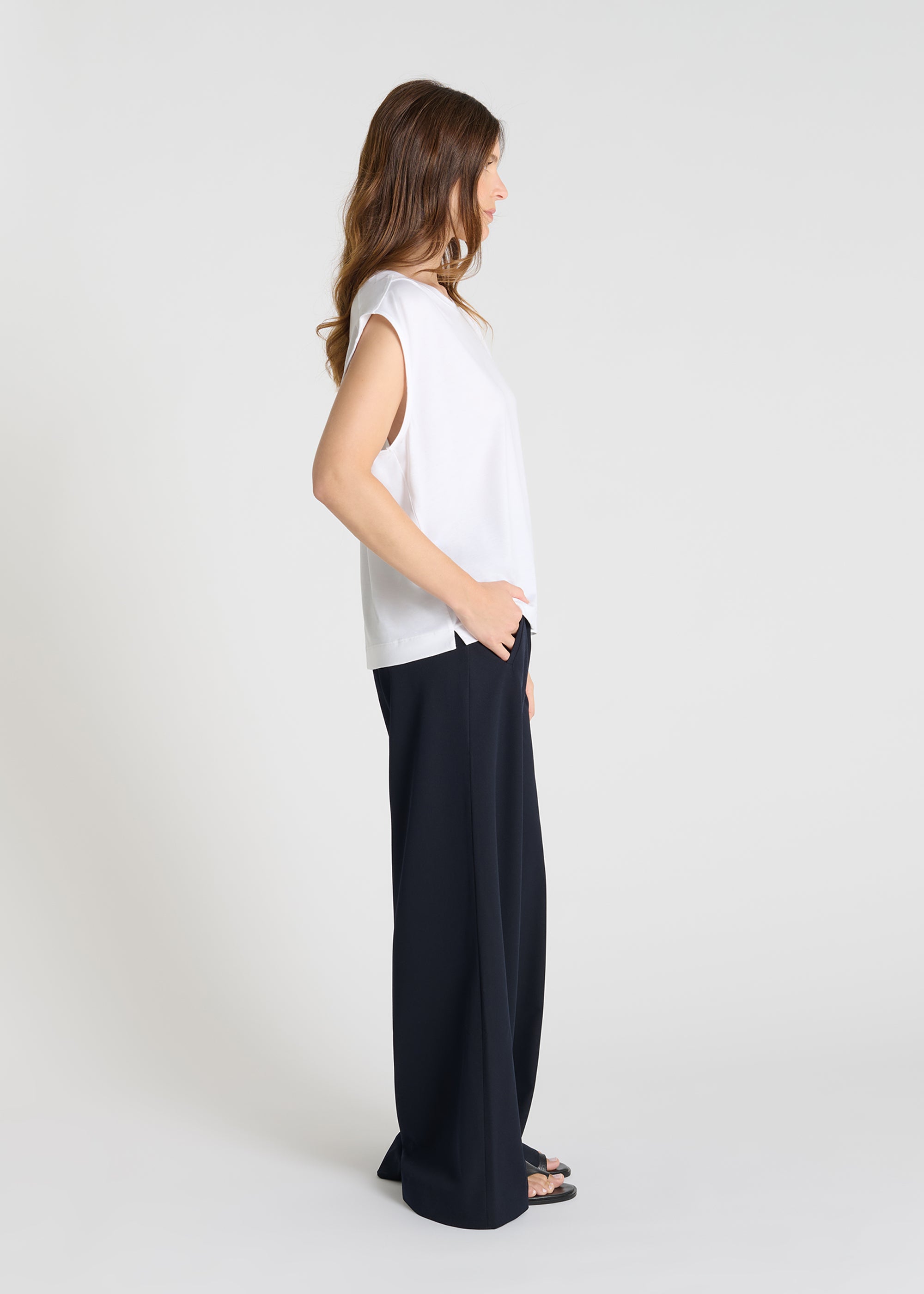 The Krish T-shirt combines the lightness of lyocell cotton jersey with a straight, relaxed fit, perfect for an effortless style. Its round neck and sleeveless design create a clean look, while the shoulder yoke and side slits add a subtly structured touch.