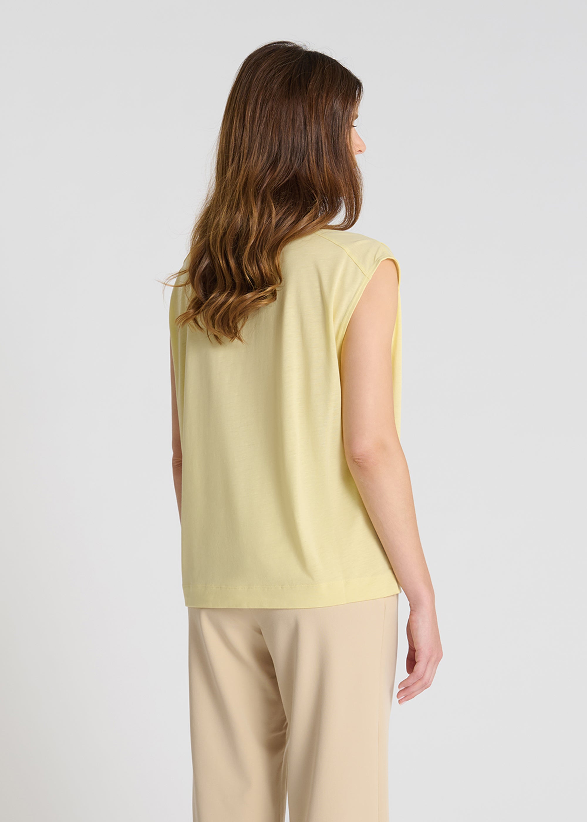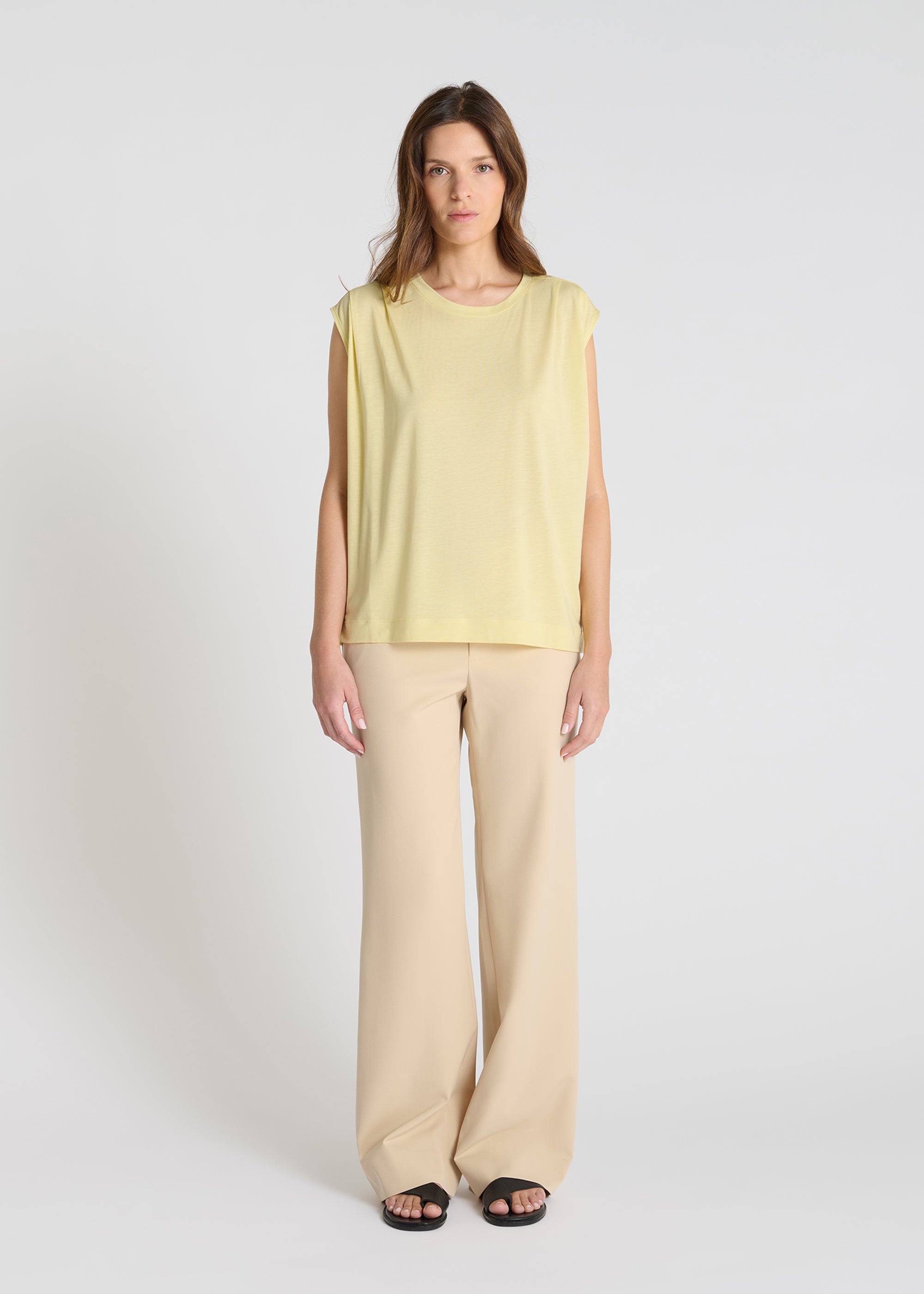 The Krish T-shirt combines the lightness of lyocell cotton jersey with a straight, relaxed fit, perfect for an effortless style. Its round neck and sleeveless design create a clean look, while the shoulder yoke and side slits add a subtly structured touch.