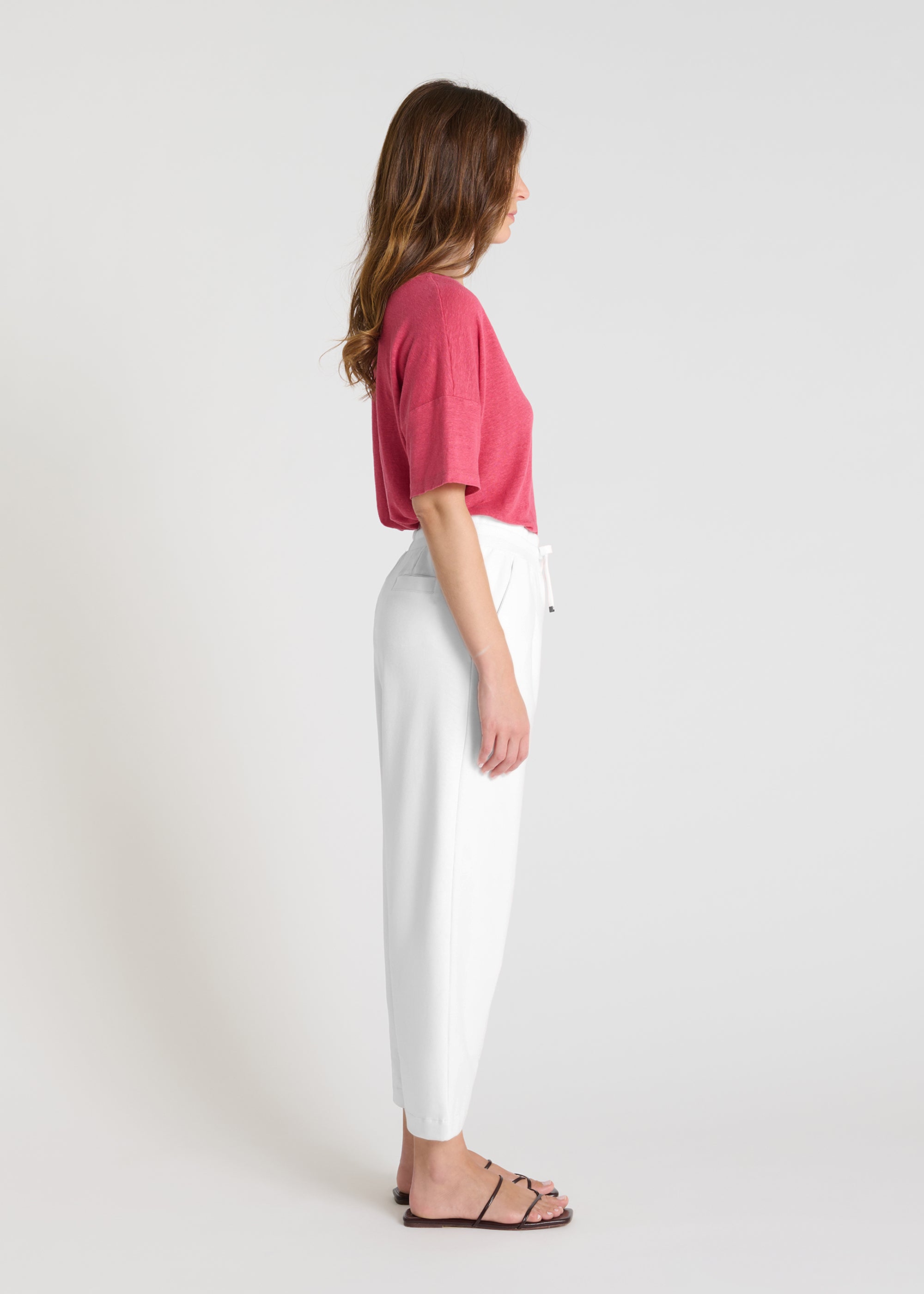 These women's joggers offer a fresh take on casual style with a structured yet comfortable carrot cut. Made from fleece, they provide a soft and pleasant feel. The waist is accentuated by an elasticated waistband, adjustable with drawstrings for a customizable fit. Flat pleats at the front add structure to the silhouette, while the Italian-style pockets enhance its practicality. A discreet welt pocket at the back completes the design.