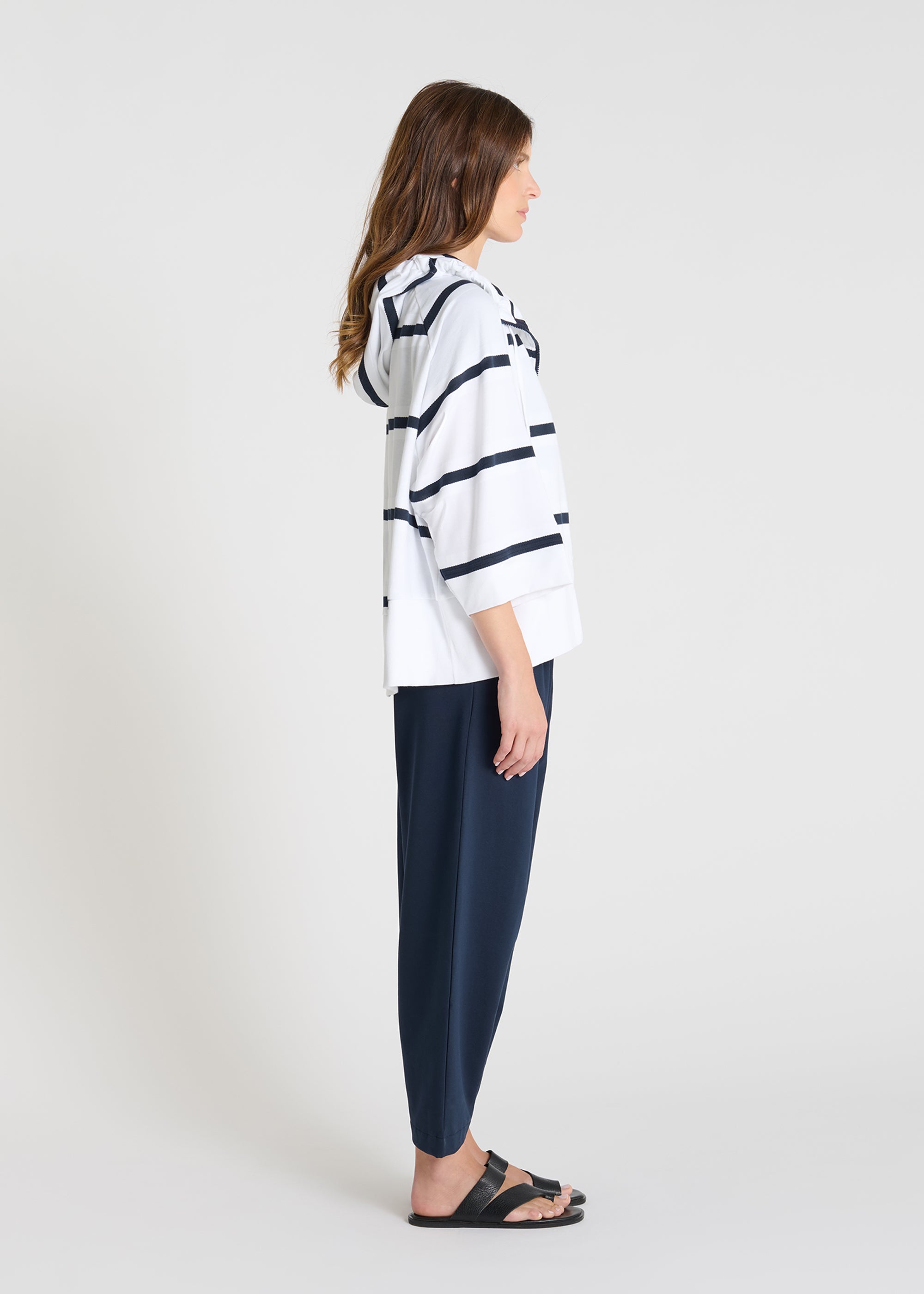 Its striped fleece plays with graphic contrasts to structure the silhouette, while the slightly flared shape and three-quarter sleeves lend a soft, modern look. The hood, cinched with ribbed ties, extends this casual feel, complemented by side pockets also trimmed with ribbing. Fastened with a double-slider zip, Rajan R can be worn as desired, as a light layering piece or as a statement piece, for a silhouette that is both comfortable and assertive.
