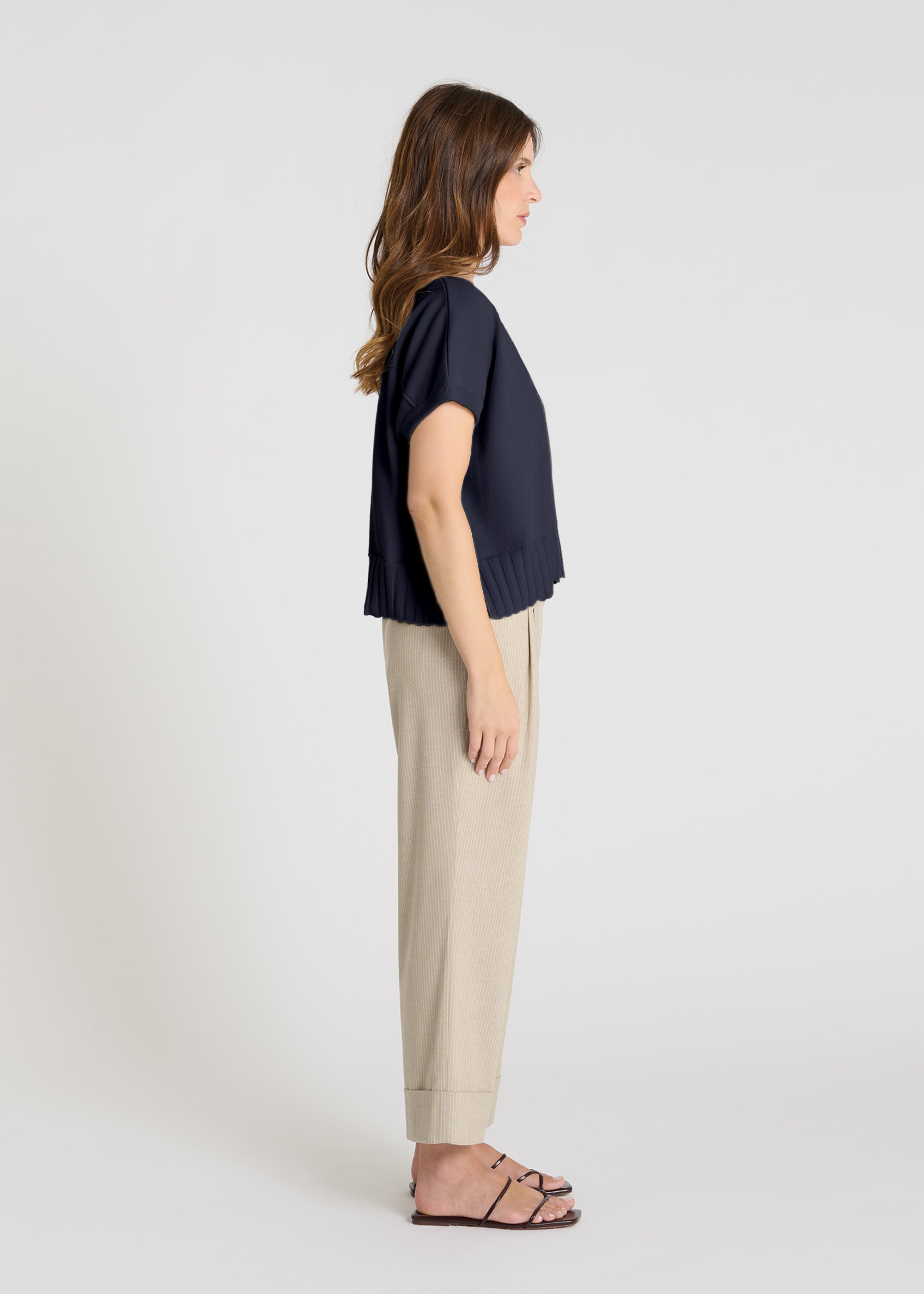 The Tournesol sweater, a sleeveless cotton knit, features a boxy silhouette for a straight, modern look. Its V-neckline flatters the décolletage, while the graphic ribbing at the hem adds rhythm to the silhouette. A horizontal rib at the back highlights the knit and adds a subtle visual detail. An easy-to-layer piece, ideal for between seasons.