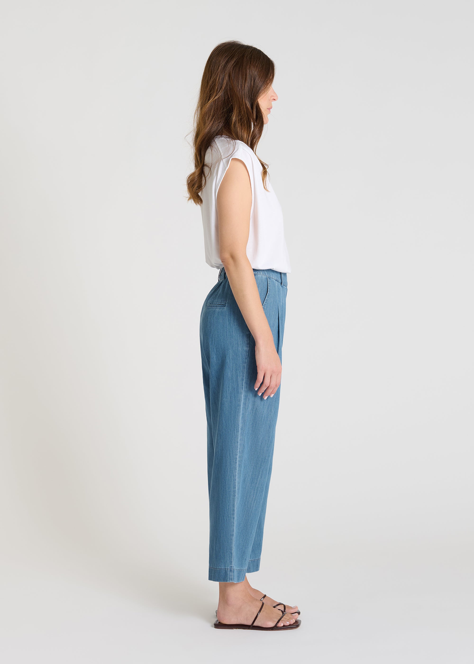 The pleats at the front create volume and complement a wide leg, resulting in a balanced and natural silhouette. Side pockets and a welt pocket at the back highlight the refined finish, while the ankle length enhances the modern look of these cotton denim trousers.