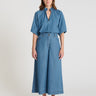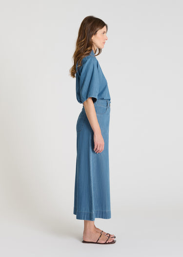 With Omano, you'll adopt a confident and modern silhouette. These 100% cotton denim culottes feature flat pleats that elegantly structure the front. The crossed belt loops add a subtle graphic touch, while the cutout below the waistband and patch pockets in the back create a decidedly denim look.