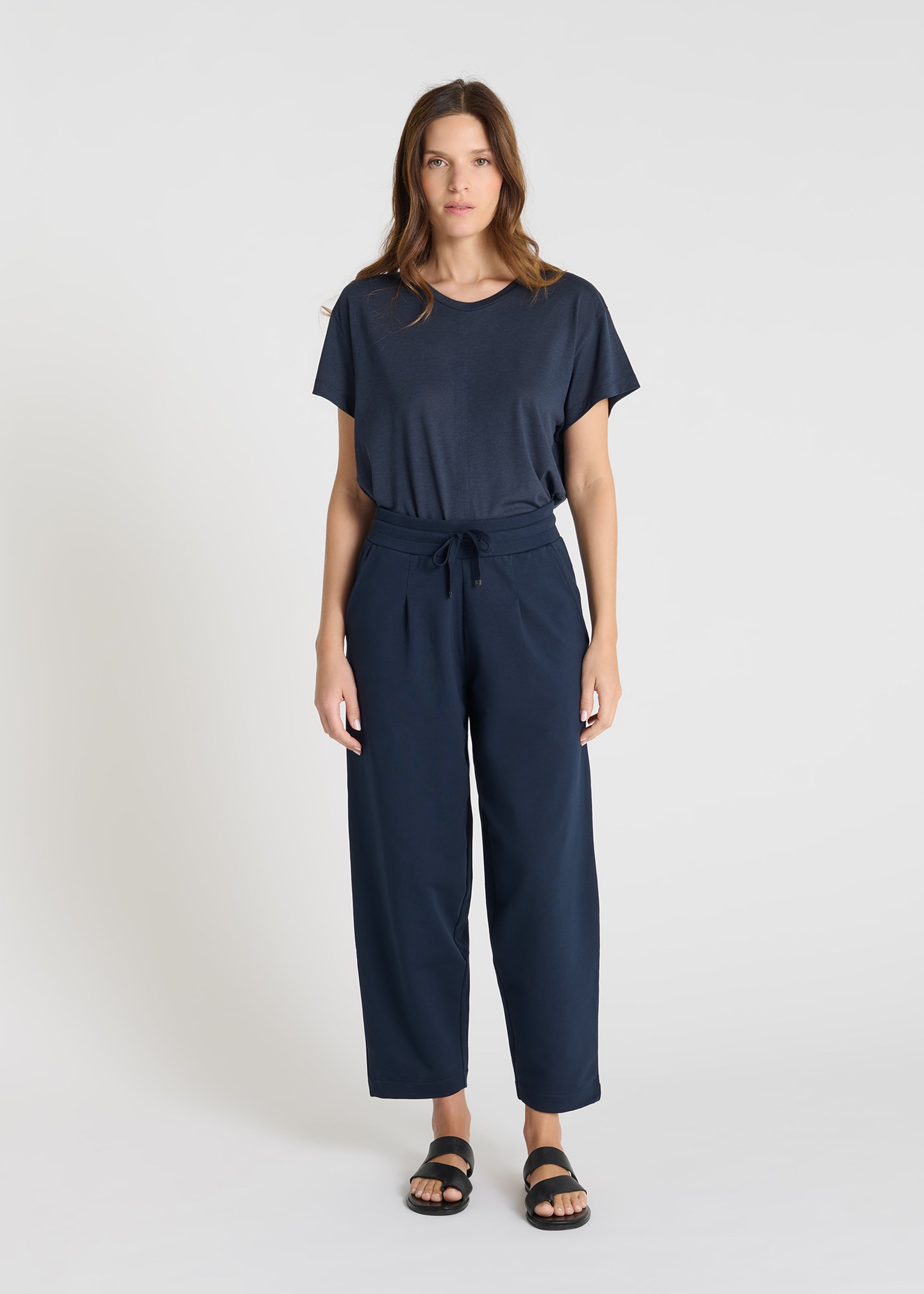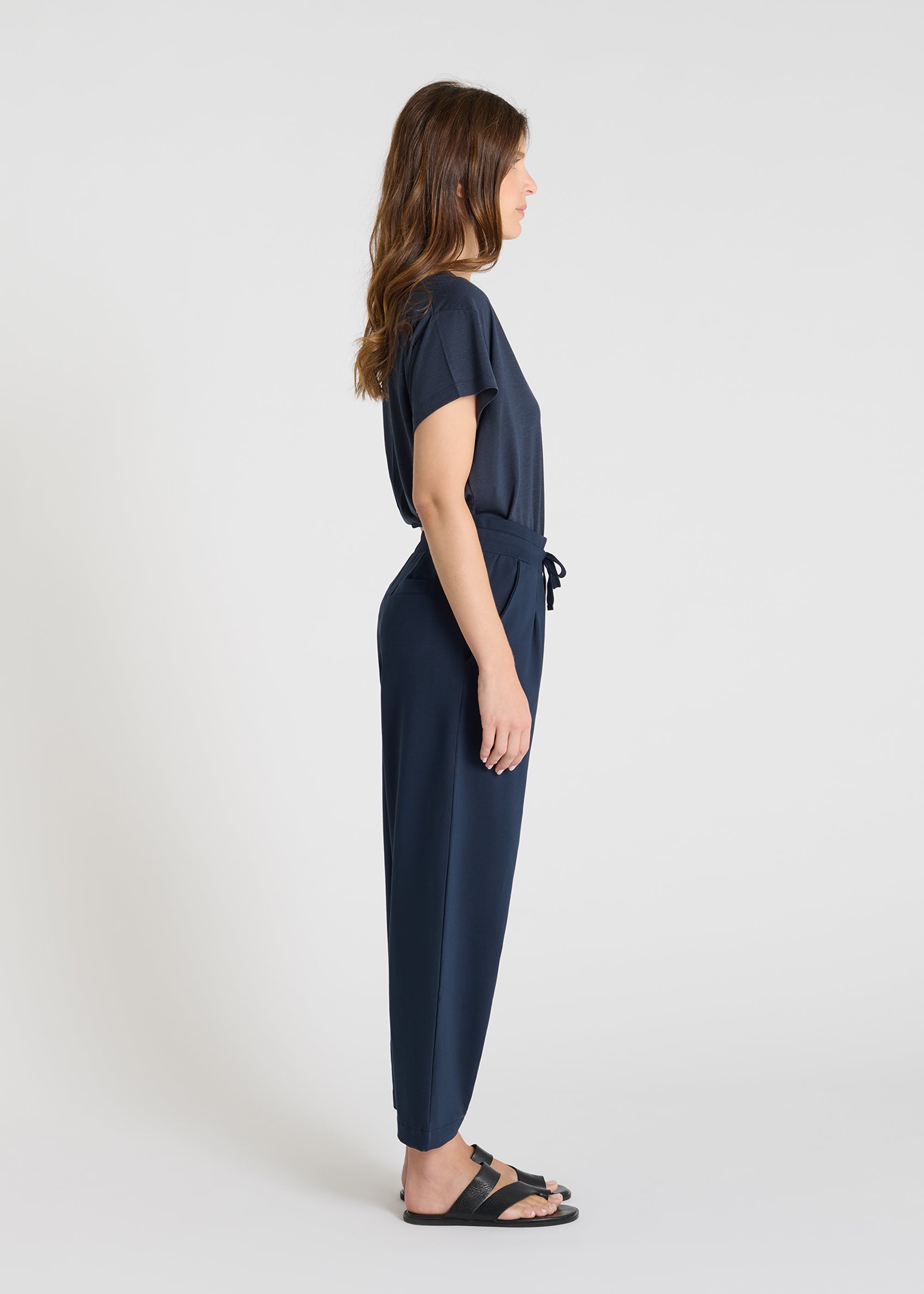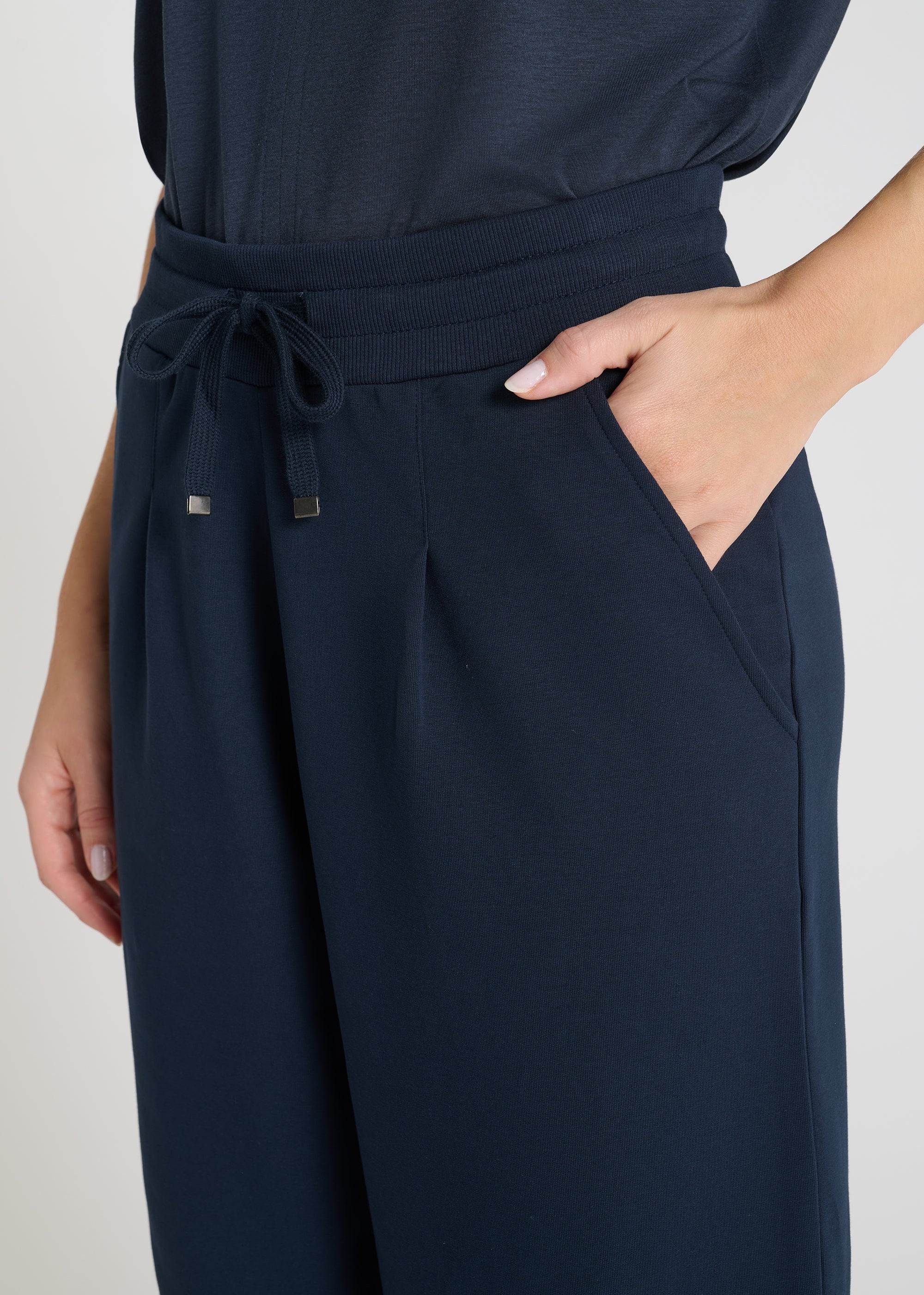 These women's joggers offer a fresh take on casual style with a structured yet comfortable carrot cut. Made from fleece, they provide a soft and pleasant feel. The waist is accentuated by an elasticated waistband, adjustable with drawstrings for a customizable fit. Flat pleats at the front add structure to the silhouette, while the Italian-style pockets enhance its practicality. A discreet welt pocket at the back completes the design.
