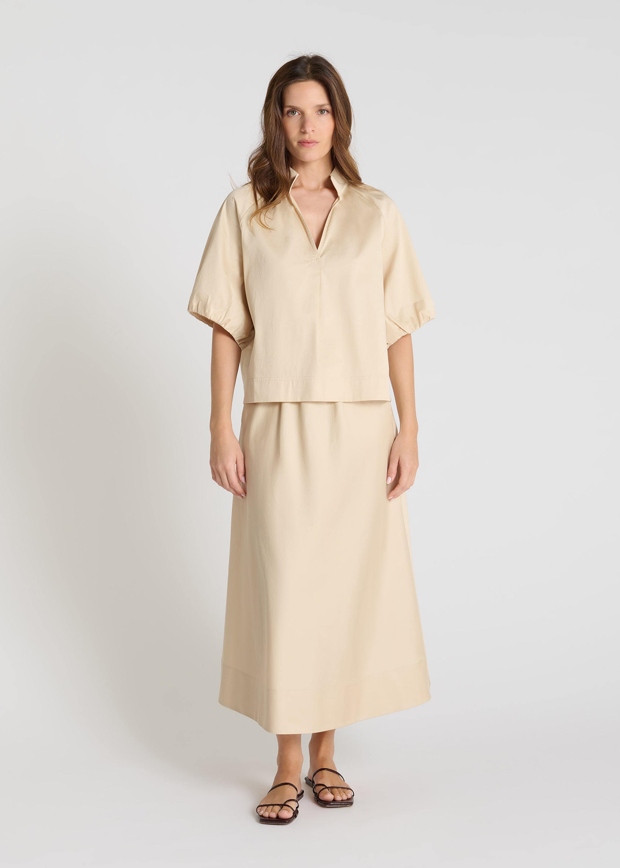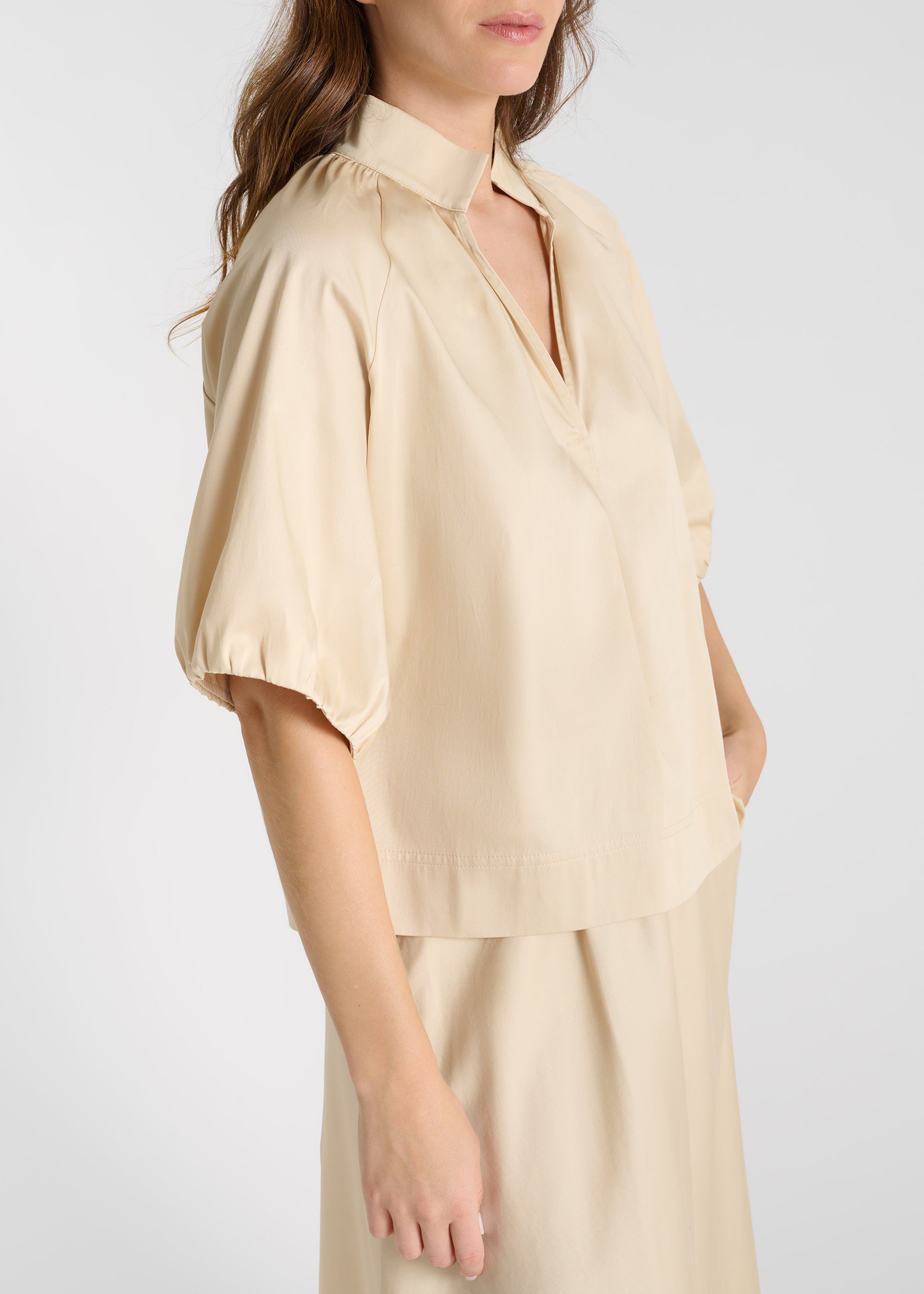 Raglan sleeves gently define the shoulder line, while the short balloon sleeves feature pleats at the hem that subtly accentuate the rounded effect. Gathering under the neckline at the back and shoulders adds texture and movement without weighing down the silhouette. The high collar sits naturally and opens into a V-neck, revealing the neck in just the right amount of detail.