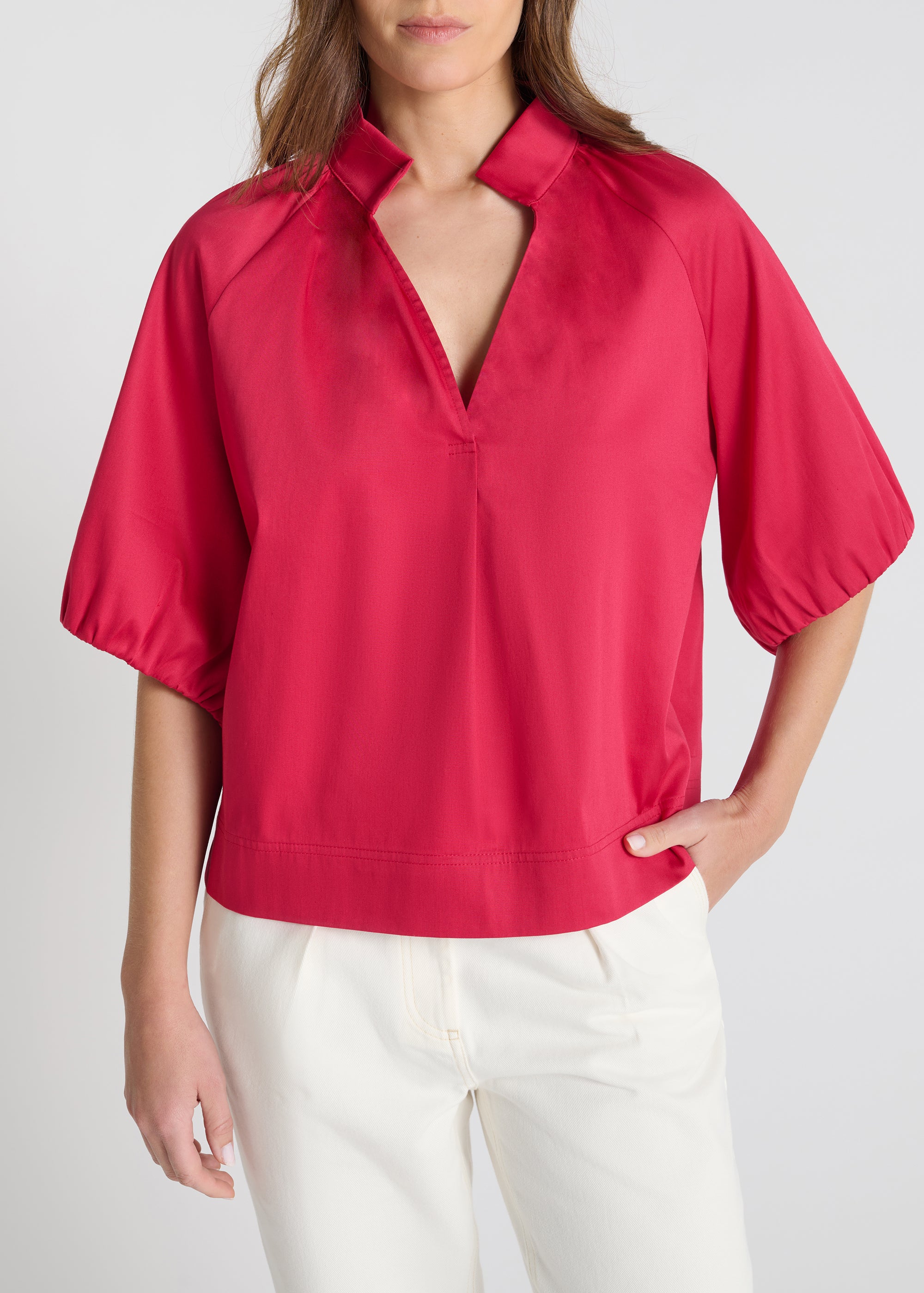 Raglan sleeves gently define the shoulder line, while the short balloon sleeves feature pleats at the hem that subtly accentuate the rounded effect. Gathering under the neckline at the back and shoulders adds texture and movement without weighing down the silhouette. The high collar sits naturally and opens into a V-neck, revealing the neck in just the right amount of detail.
