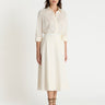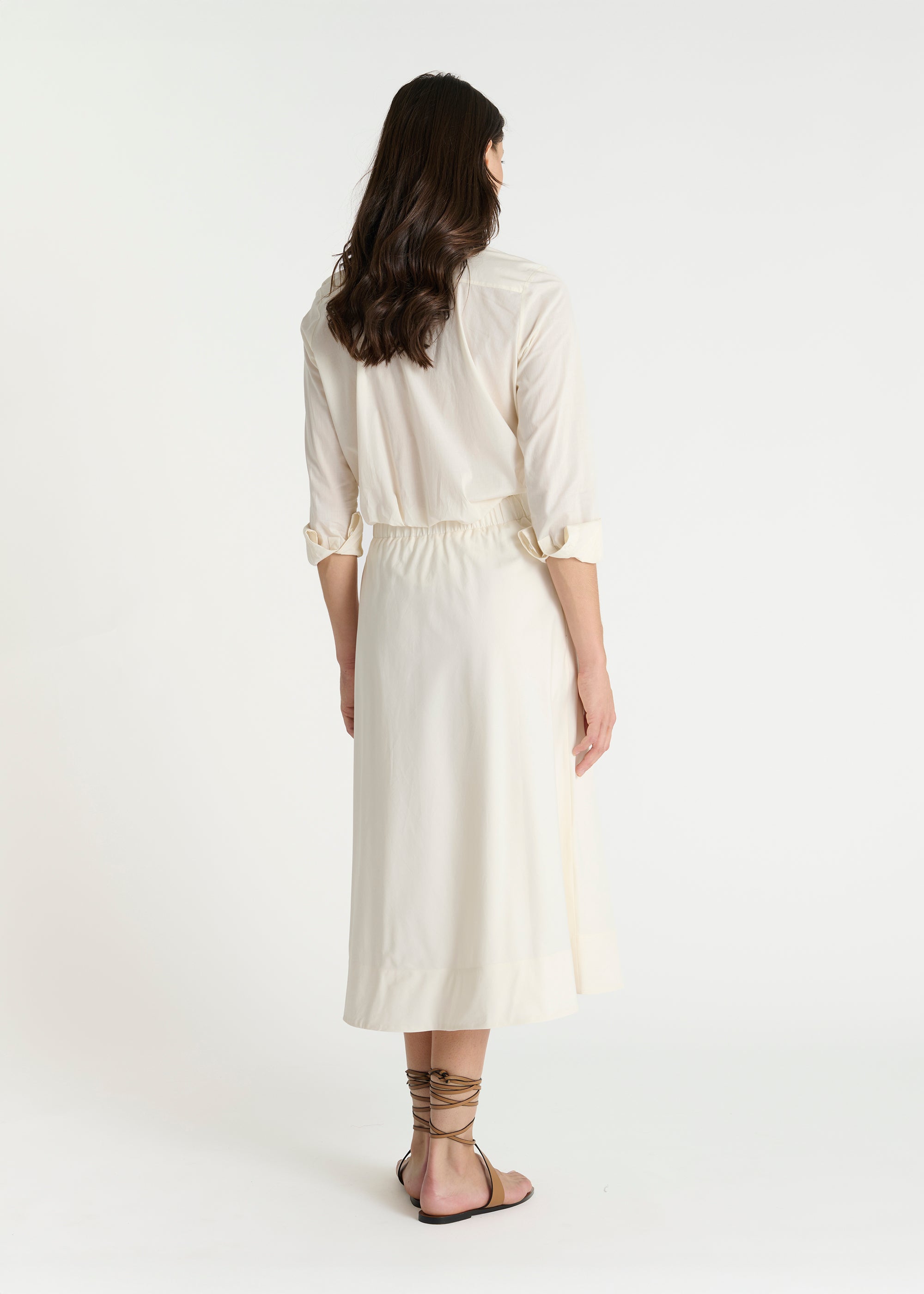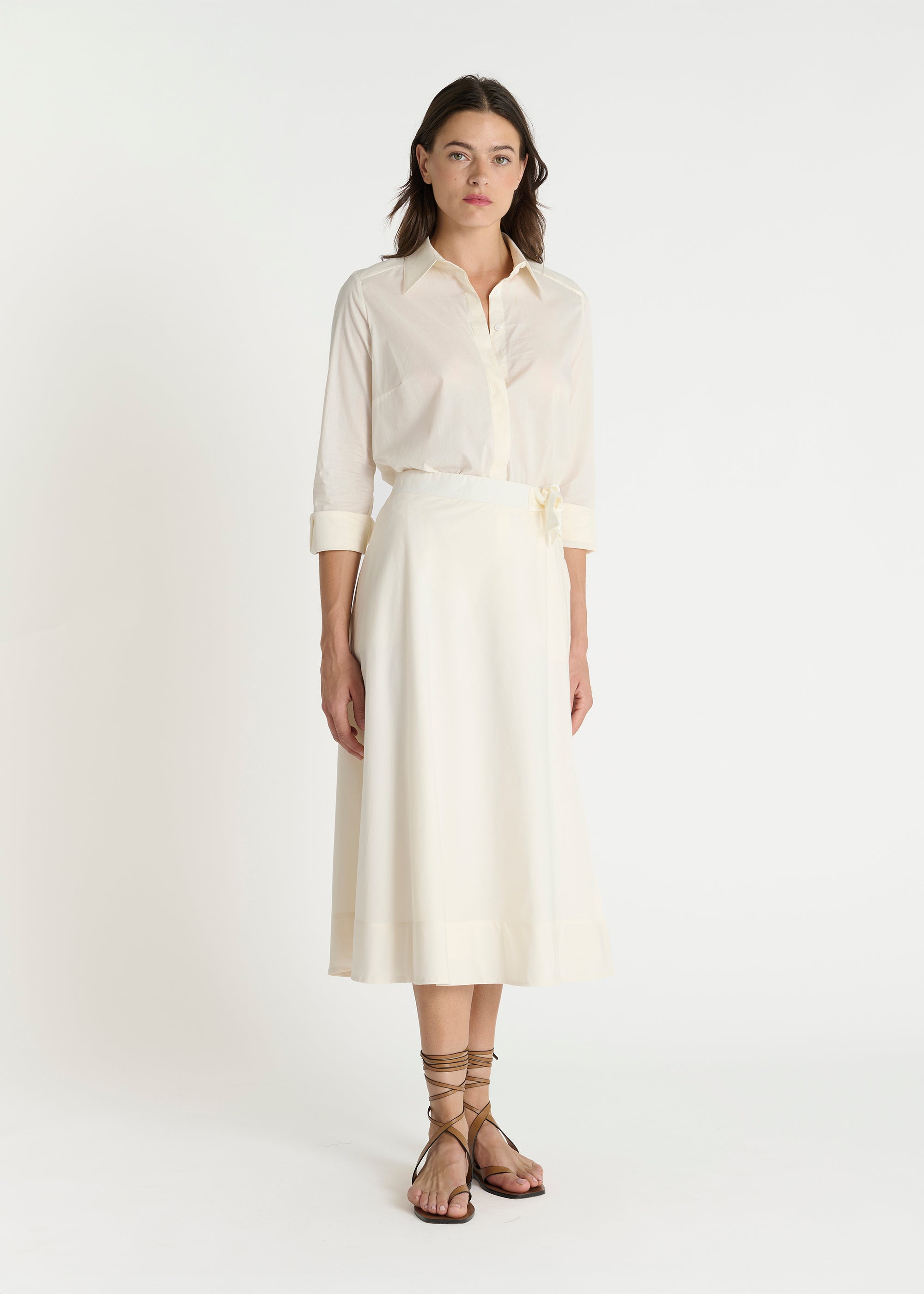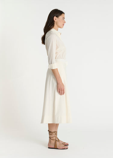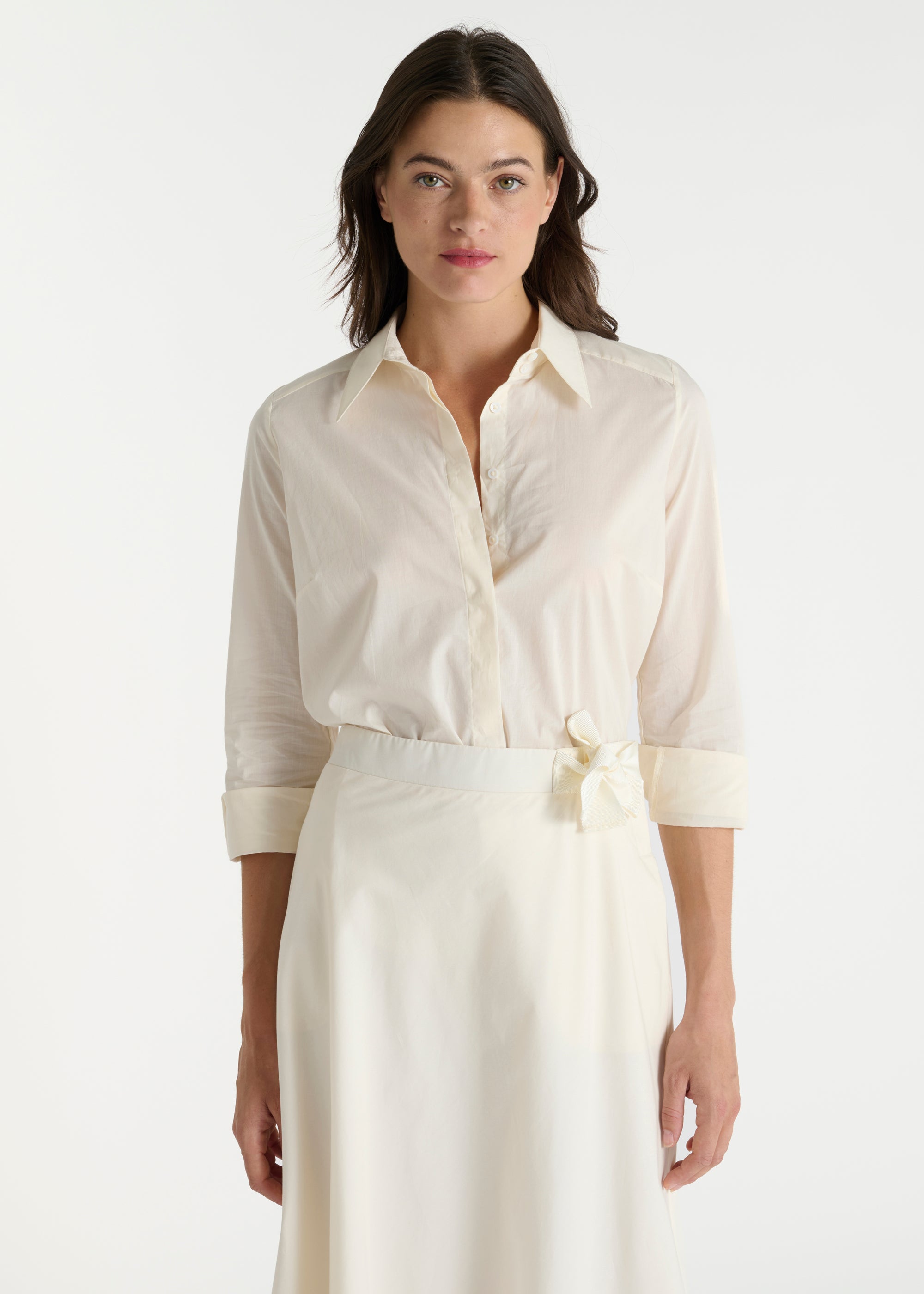 The Sofia shirt embodies the essence of timeless sophistication. Crafted from delicate cotton voile, it features a clean collar fastened with nine subtly concealed mother-of-pearl buttons. A back seam creates movement, while the long sleeves with adjustable notched cuffs offer a refined finish. Its asymmetrical silhouette—straight at the front, generously rounded at the back—reveals a construction designed to flatter the figure with grace and elegance.