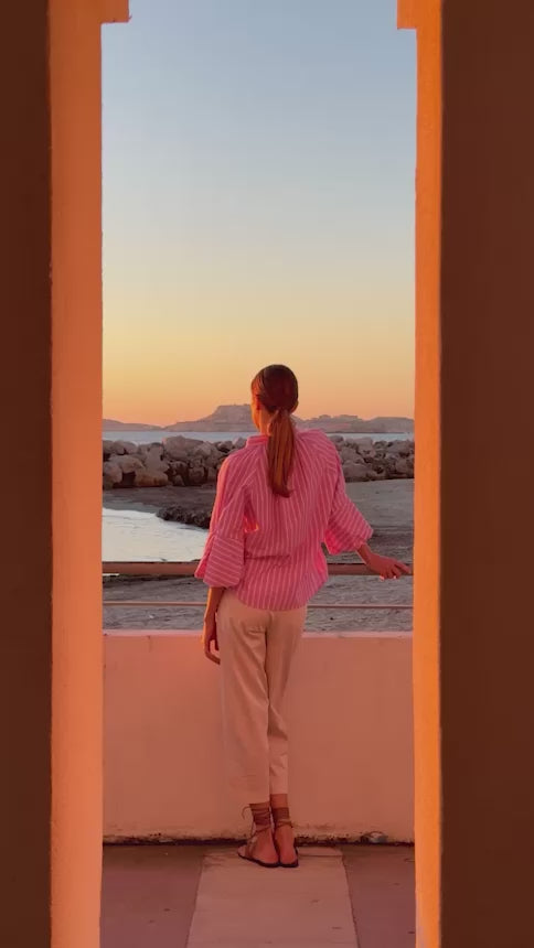 Cette saison, la femme Hana San s’imprègne des lumières chaudes d’un coucher de soleil marseillais. Entre bleu profond, rouge carmin et nuances terracotta, elle incarne une élégance libre et solaire.
