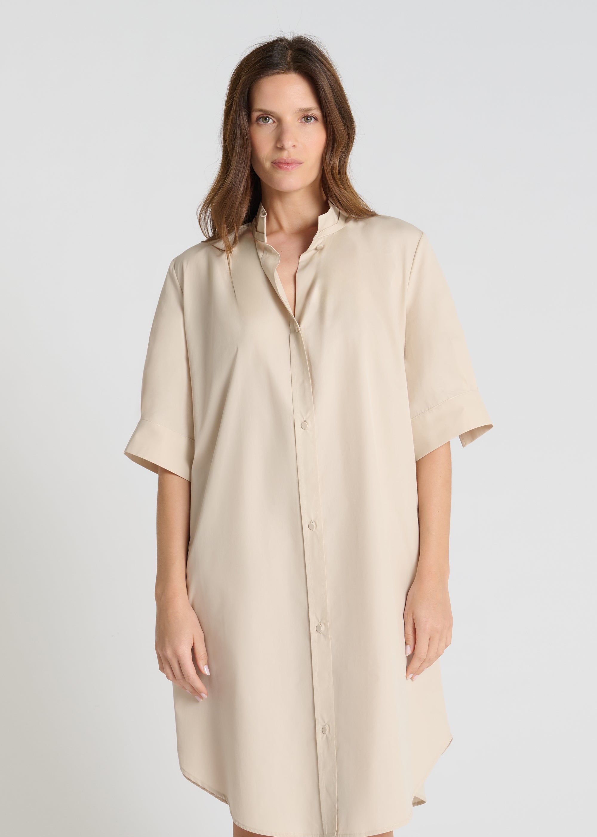 La robe Amaryllis revisite la robe-chemise en popeline stretch avec une coupe fluide et moderne, idéale pour celles qui recherchent une robe chemise femme facile et élégante. Son col montant structure immédiatement la silhouette et apporte cette touche contemporaine propre à la marque.