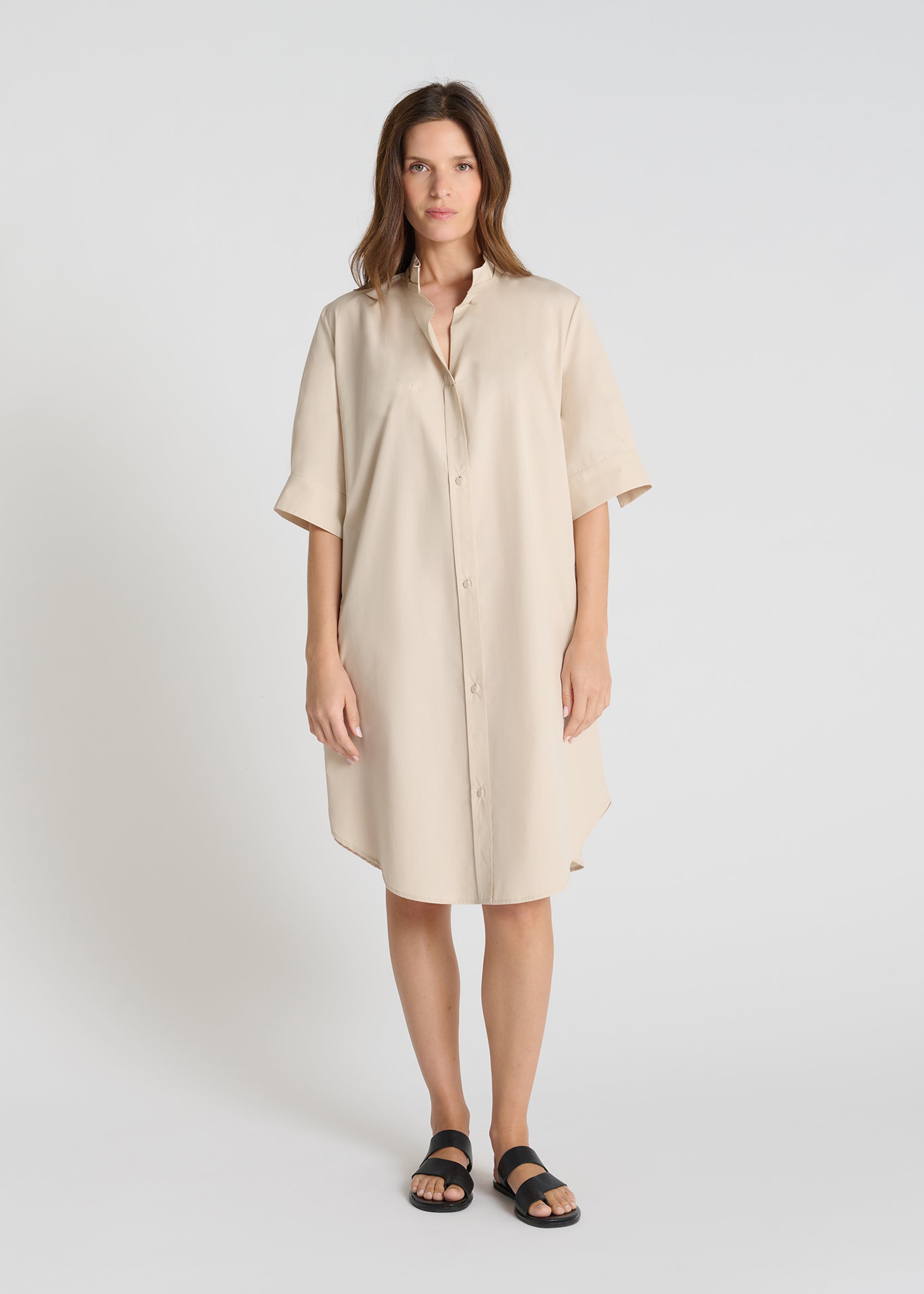 Les manches courtes sont ponctuées d’une fente marquée, un détail graphique qui apporte du mouvement et signe le style de cette robe en popeline. La base arrondie et le pli d’aisance au dos renforcent la fluidité du modèle, pour une pièce confortable et raffinée au quotidien.